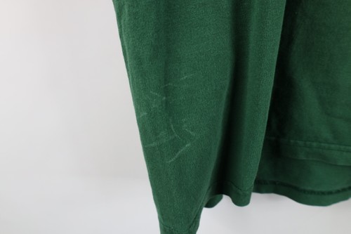Bleach blemishes right arm. Blemishes, dark spots throughout. Collar, arms discolored. Graphics, color faded. Pilling. Tag faded