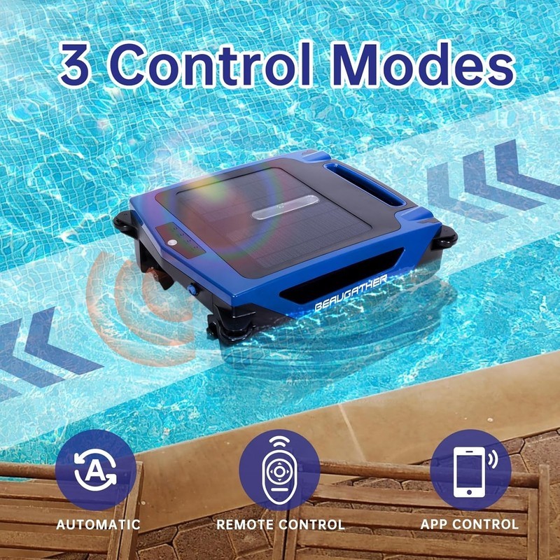 ?3 Control Modes?(1) Automatic cleaning; (2) Remote control, you can freely control the direction and speed; (3) Mobile phone APP control, in addition to controlling the direction and speed, you can also check the solar pool skimmer's battery level