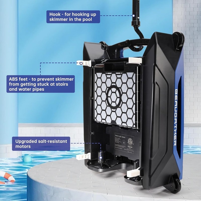 ?Radar Detection and Intelligent Navigation?It will automatically back up when it encounters a dead corner, and turn 90 when it touches a wall, and if you add 4 ?FEET?, it can avoid getting stuck on the stairs and hoses, and the skimmer will no longer be trapped, and it is suitable for pools of any shapes