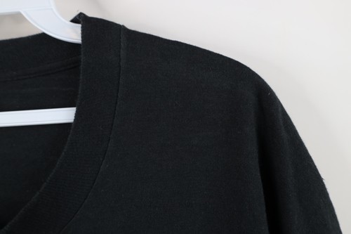 Blemishes front, back, shoulders, collar/inner collar. Loose thread bottom hem. Collar, arms discolored. Graphics, color faded. Pilling. Made in USA
