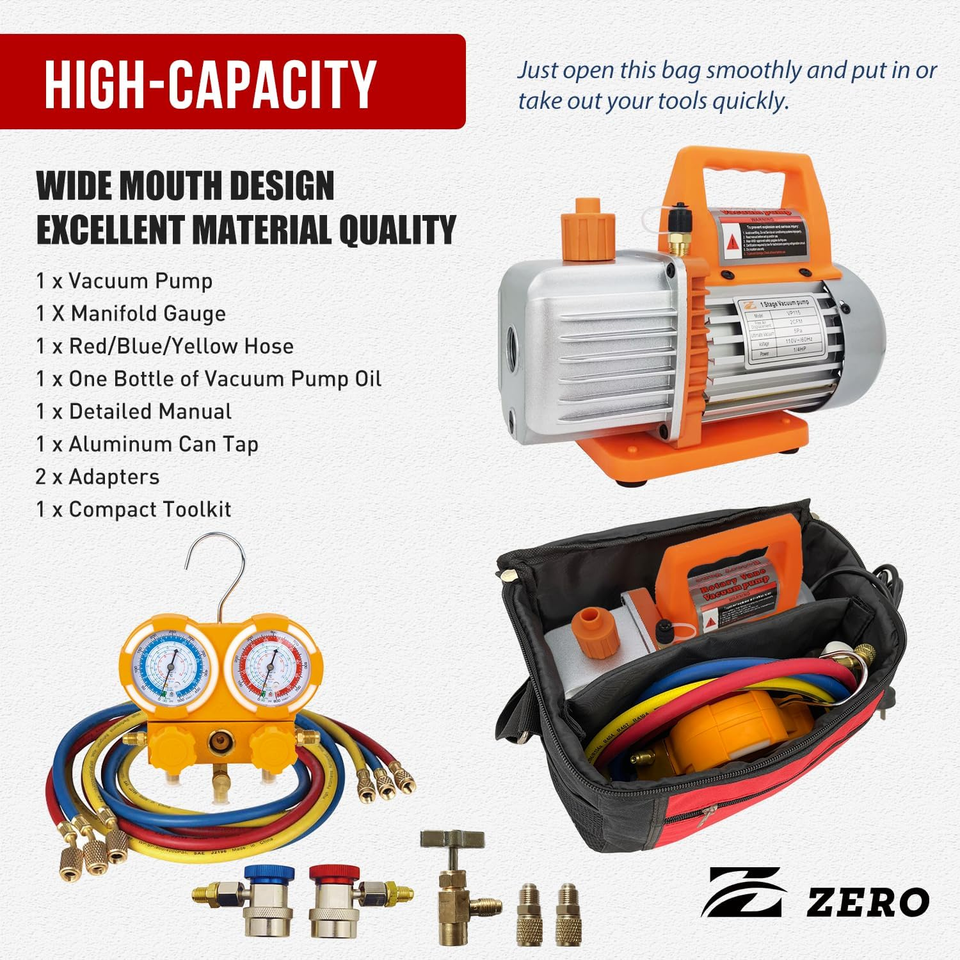Z 110V 1/4HP 2 CFM AC Vacuum Pump Kit and AC Gauge Set, Single Stage Rotary Vane Air Vacuum Pump HVAC Gauges, with Three-Color Hose Carry Bag, Applicable to R134A R12 R22 R410A