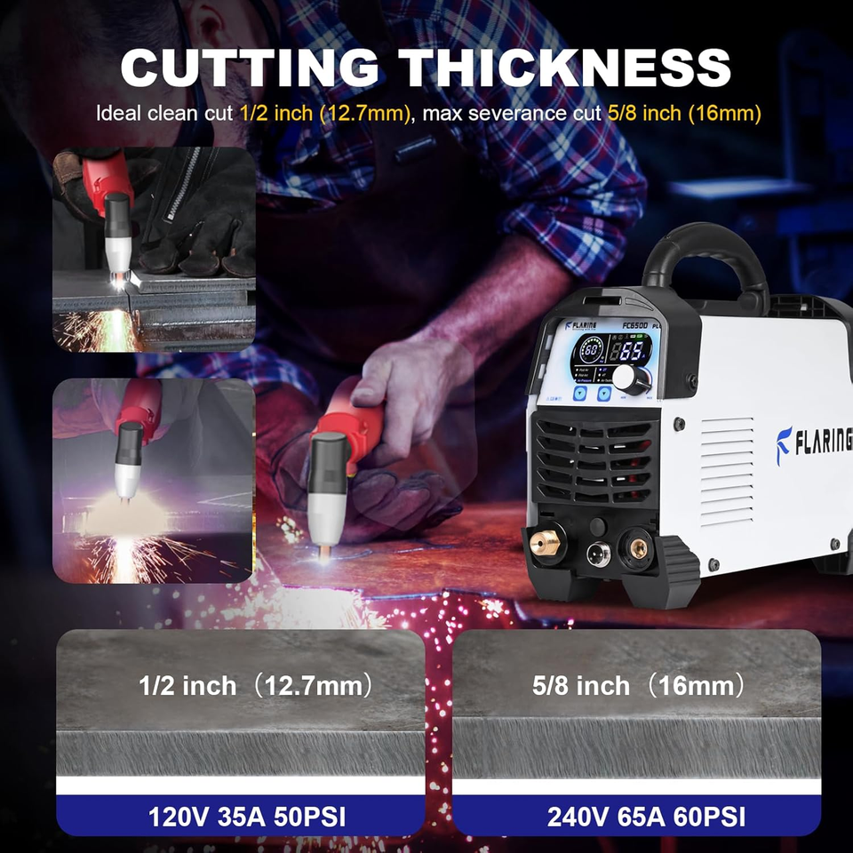 POWERFUL CUTTING PERFORMANCE: 60/65Hz high-frequency IGBT inverter, 120V/240V dual voltage. The maximum current can reach 35A at 120V and 65A at 240V. 1/2"(12mm) clean cut at 35A 120V 50PSI, 5/8"(16mm) severance cut at 60A 240V 60 PSI. Recommended breaker size: 40A at 240V, 55A at 120V. Air compressor required: 90 PSI, 60 L/min or above