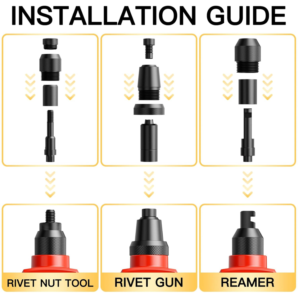 One tool with three functions. Rivet nut tool, rivet gun and reamer all in one. WETOLS is committed to creating convenient and fast hand tools. Just change the head of the tool and the three working modes can be switched at will