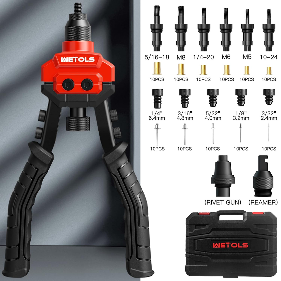 Professional Rivet Gun Kit with 5 Rivet Heads and 6 Metric SAE Mandrels, Hand Riveter Tool with 50 Rivets and 60 Rivet Nuts, Sturdy Case, WE-890