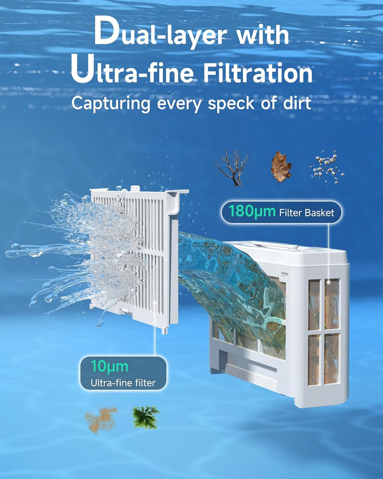 Double Filtering For Ultimate Cleaning: Introducing a new generation of pool cleaning technology, our pool vacuum is equipped with two advanced filtration baskets designed for different sizes of debris. The first filter basket features a fine mesh of 180?m to effectively intercept leaves and other large particles of trash, while the built-in ultra-fine filter specializes in traps dust and other tiny particles minimize to 10?m to ensure crystal clear water.