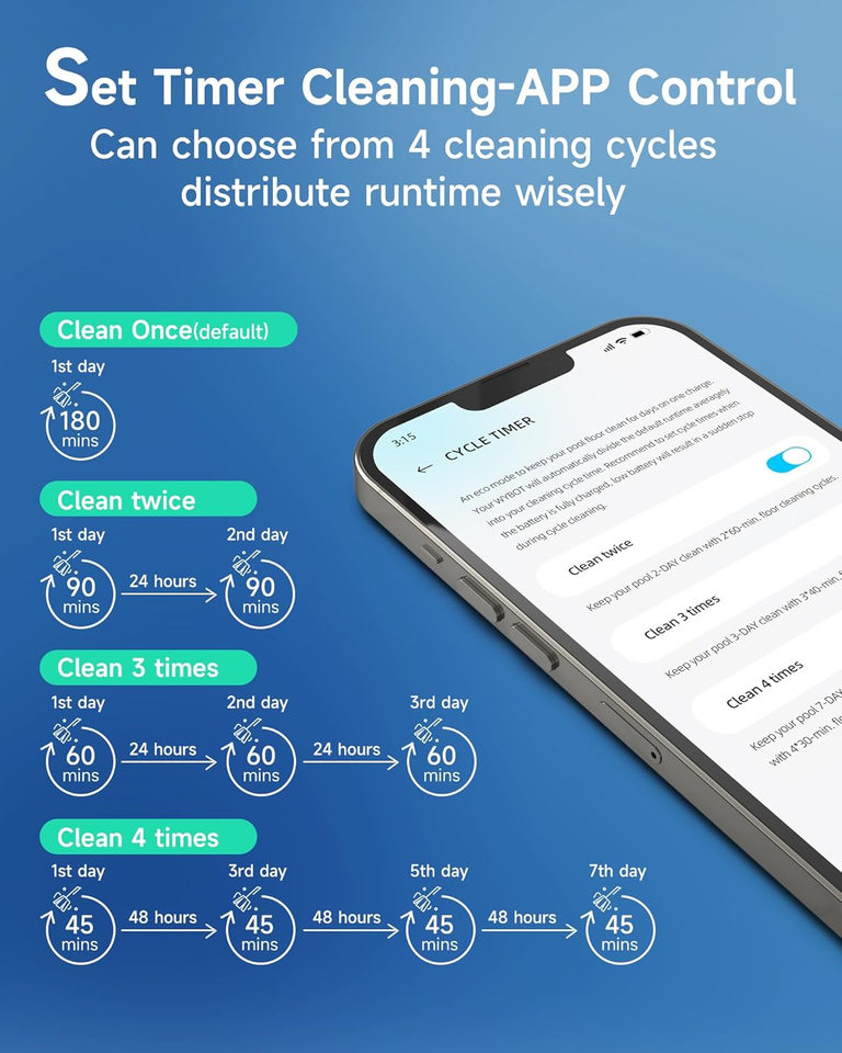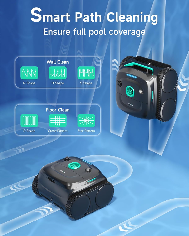 7 Mode Selection: The WYBOT C2 pool vacuum cleaner offers 7 customized cleaning modes - Standard full pool, Floor only, Wall only, Waterline only, Wall then floor, Turbo floor and Eco floor. Whether it's a full clean or a deep clean for a specific area. Additionally 6 path planing and 4 cleaning schedule for choice. Ongoing OTA upgrade service to let you know the latest optimization. Note: preset a mode while the robot on shore.
