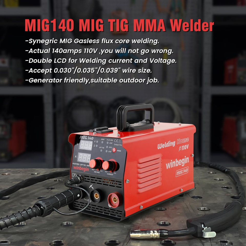 This winbegin 140A mig flux welder machine is compact, versatile and perfect for household welding needs as well as field welding jobs when camping.