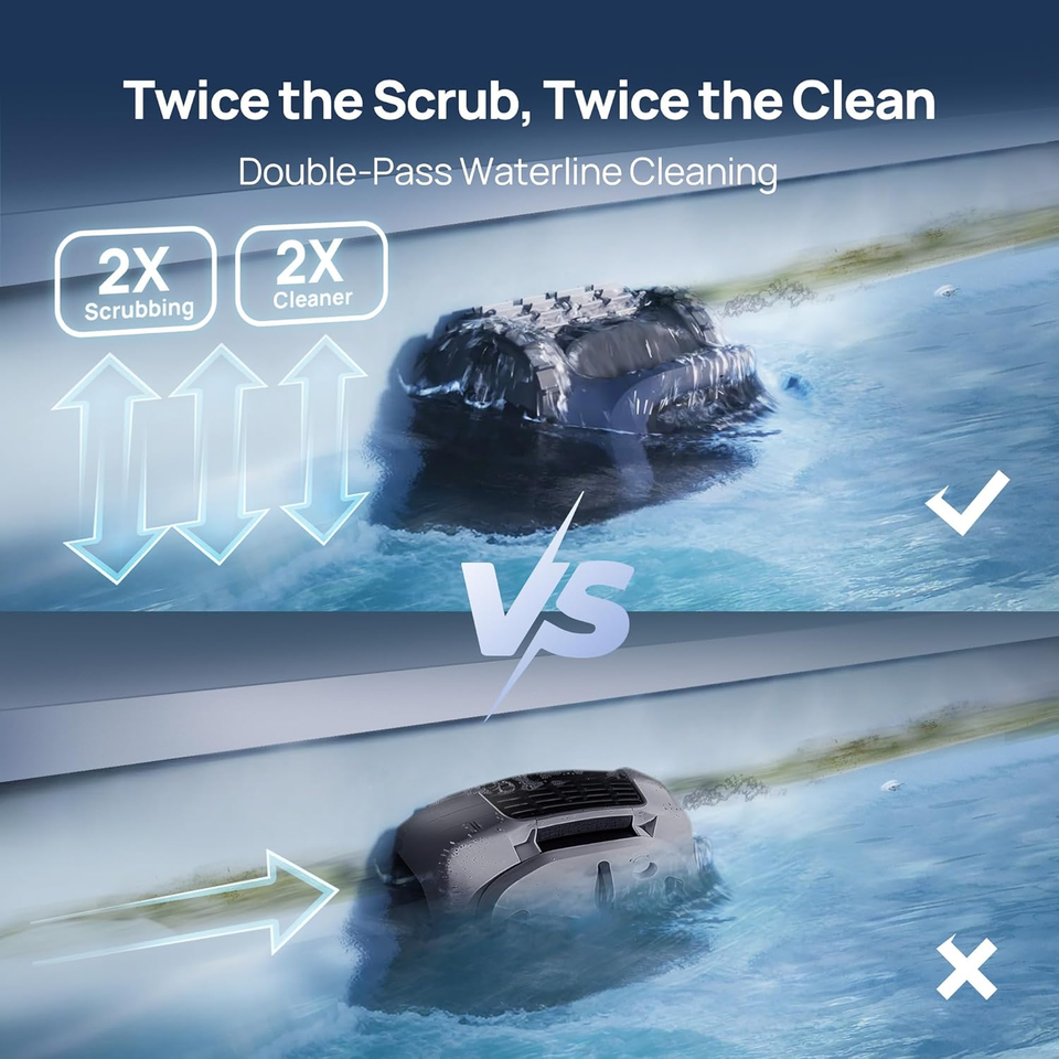 Double-Pass Waterline Scrubbing ? Scrubs your waterline twice per pass for a crystal-clear finish?outperforming standard single-pass robots.
