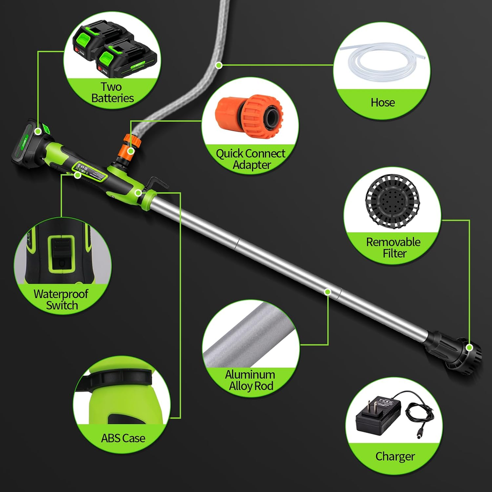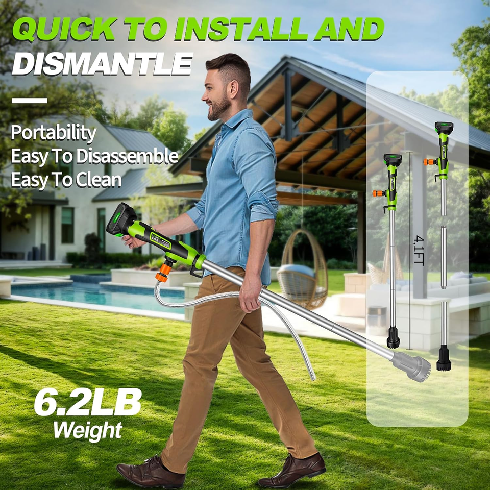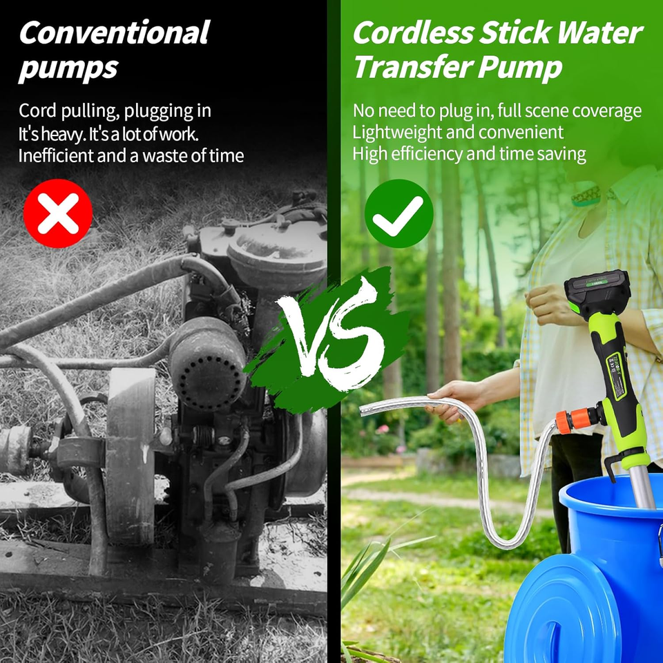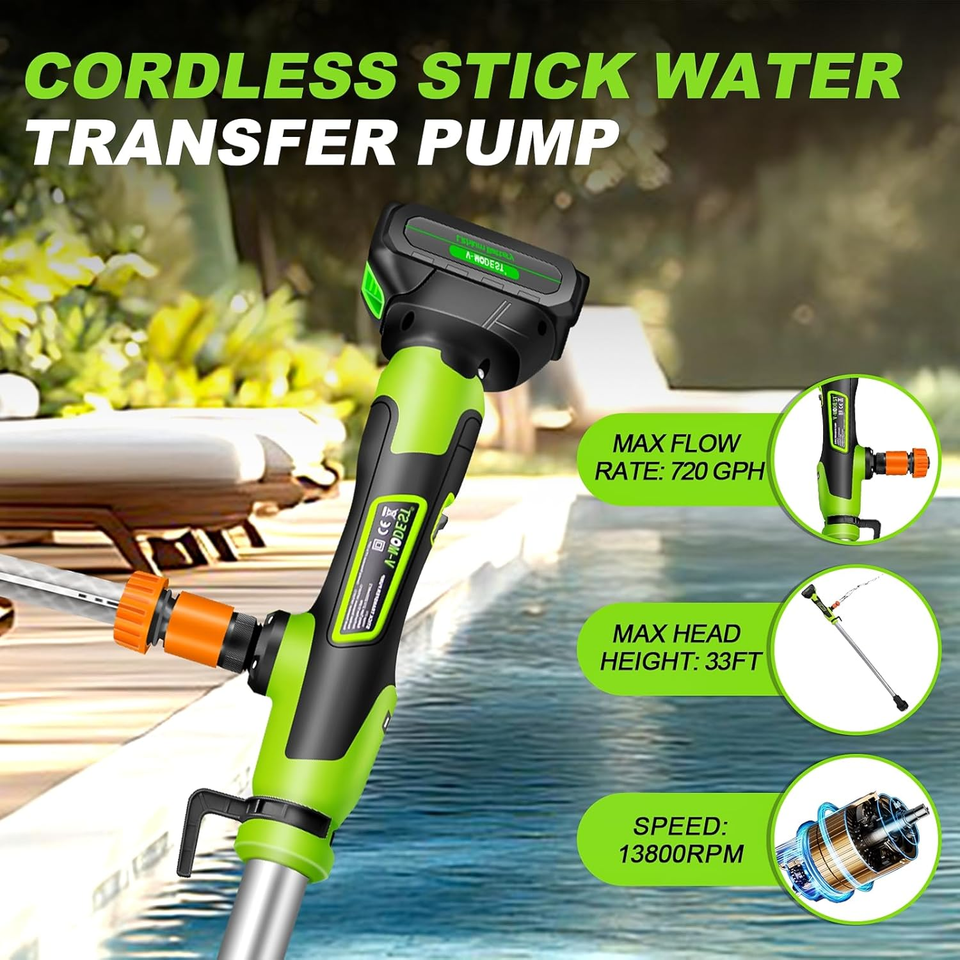 ?POWERFUL POWER OUTPUT?This cordless stick water transfer pump is equipped with a high-speed 13,800 RPM motor that effortlessly delivers water at a flow rate of 720 GPH (12 GPM). Its 33FT maximum head ensures rapid drainage, even from deep pools, flooded basements or raised garden ponds, making it ideal for emergencies and everyday use