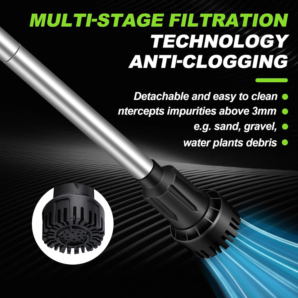 ?REMOVABLE GRADED FILTRATION SYSTEM? The portable water pump adopts removable graded filtration system, which can effectively filter impurities and Prevents clogging and ensures smooth operation of the water pump. The bottom suction design not only ensures the working efficiency of the pump under very low water level, but also avoids the damage of the stick water pump body due to the change of water level, which prolongs the service life of the pump