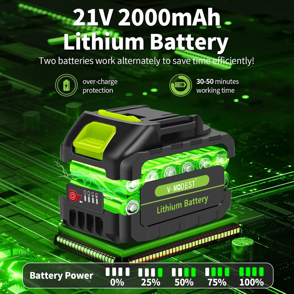 ?LONG-LASTING BATTERIES AND FAST CHARGING? Battery operated water pump Includes two 21V 2.0Ah lithium batteries, which alternate between the two batteries for uninterrupted operation. Both batteries provide up to 20-30 minutes of continuous runtime, perfect for long drainage tasks. Battery indicator light lets you know the power level at all times, allowing you to run with a plan while performing your tasks