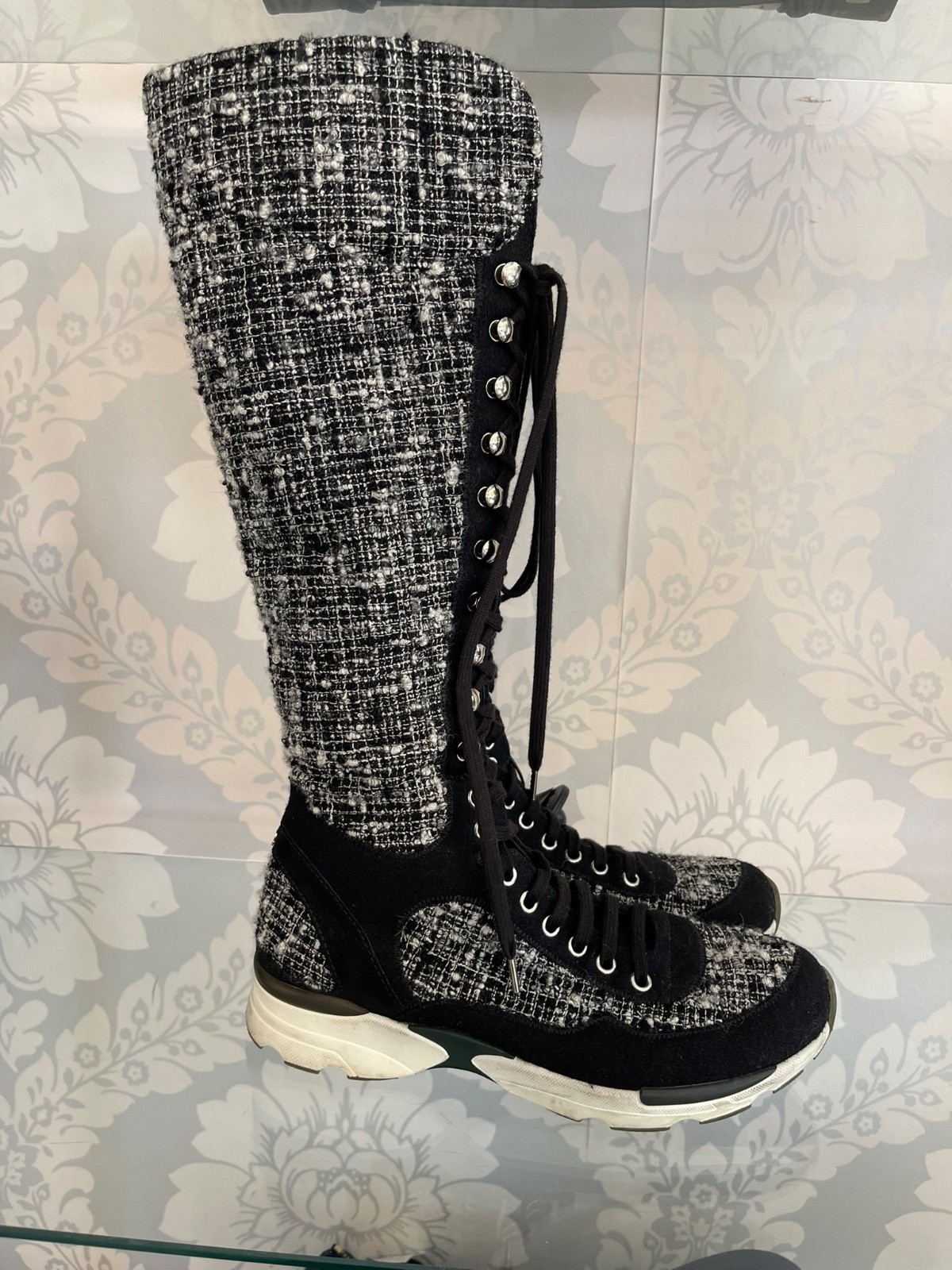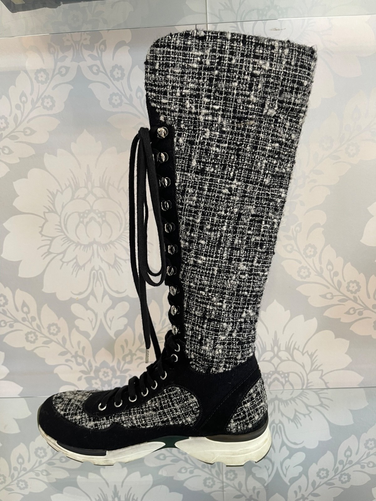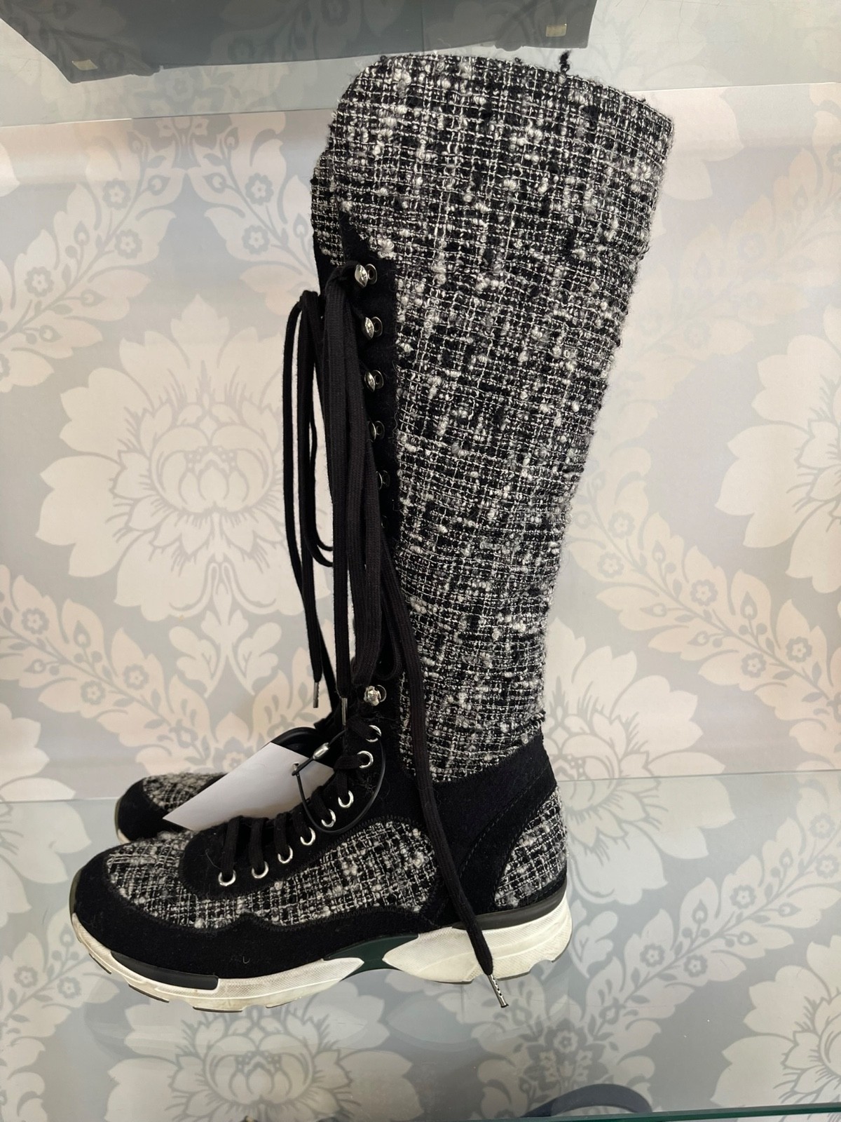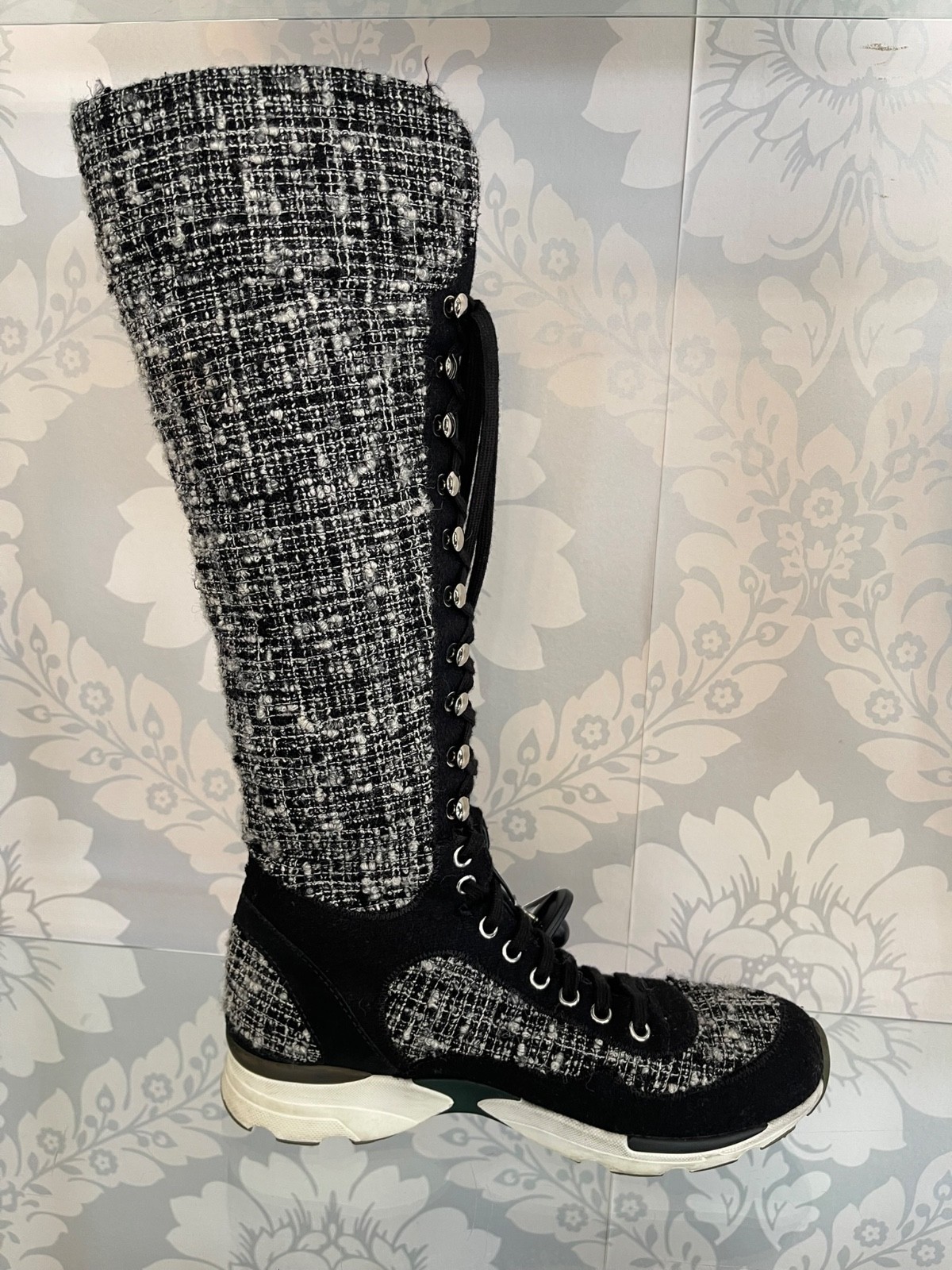 Chanel Fantasy Tweed Black & White Knee-High Sneaker Boots W/ "CC" Logo