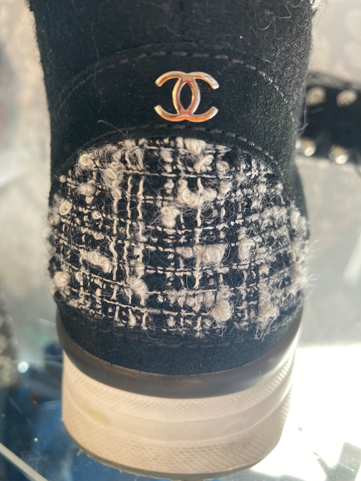 Bold, rare, and unmistakably Chanel ? these knee-high sneaker boots are crafted from the house?s signature black and white fantasy tweed, accented with the iconic ?CC? logo. Combining streetwear edge with Chanel?s couture-level craftsmanship, they?re a statement piece designed for the modern collector.