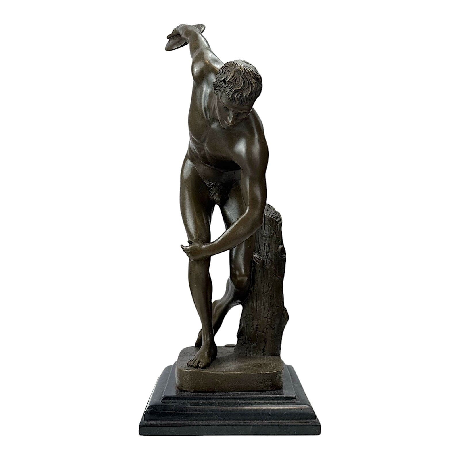 This exceptional statue is a replica of the iconic Discobolus (Discus Thrower) by the ancient Greek sculptor Myron, a masterpiece of athleticism and grace. Cast in real bronze and mounted on a sleek marble base, it stands at 14.96 inches tall, perfectly capturing the moment of motion as the athlete prepares to throw the discus. A symbol of strength and beauty, this statue brings the timeless elegance of ancient Greek art into any space. The original Discobolus is displayed at the Panathenaic Stadium Museum in Athens.