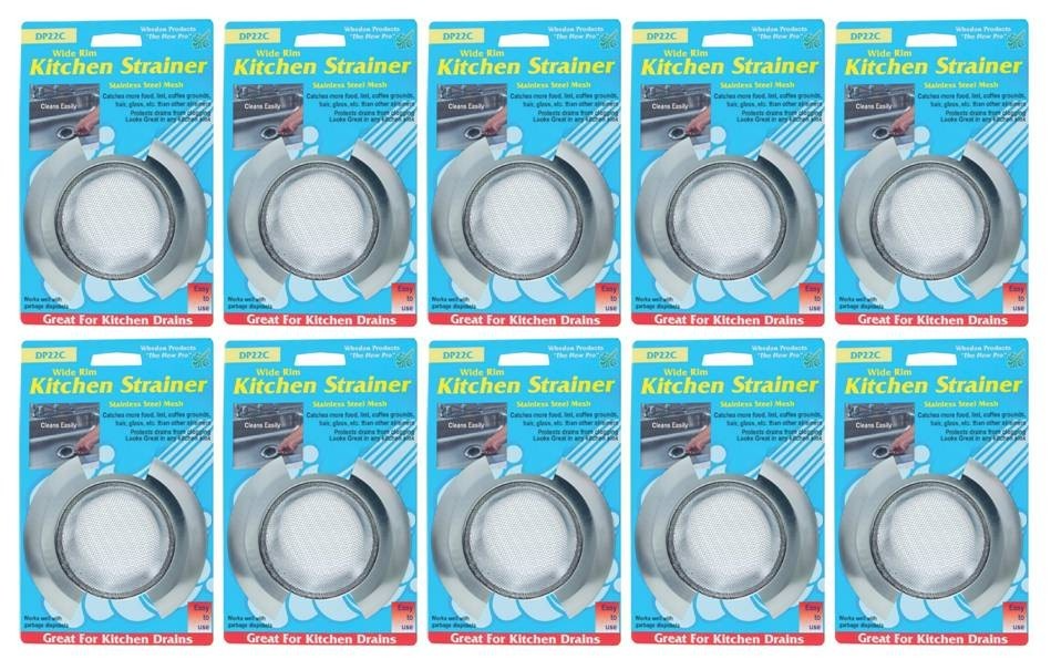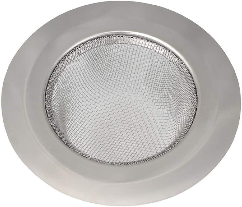 This stainless steel kitchen strainer catches more food, lint, coffee grounds, hair, glass, etc. than other strainers. Made with stainless steel mesh. Works well with garbage disposals. Comes with extra wide chrome ring.