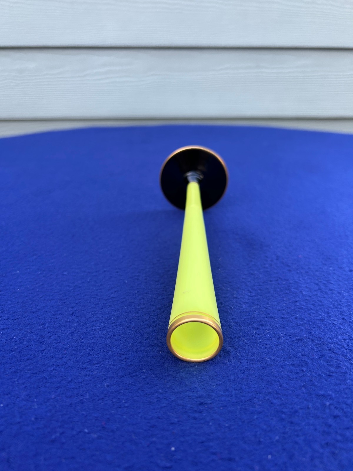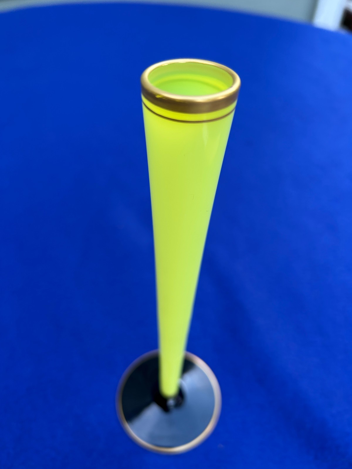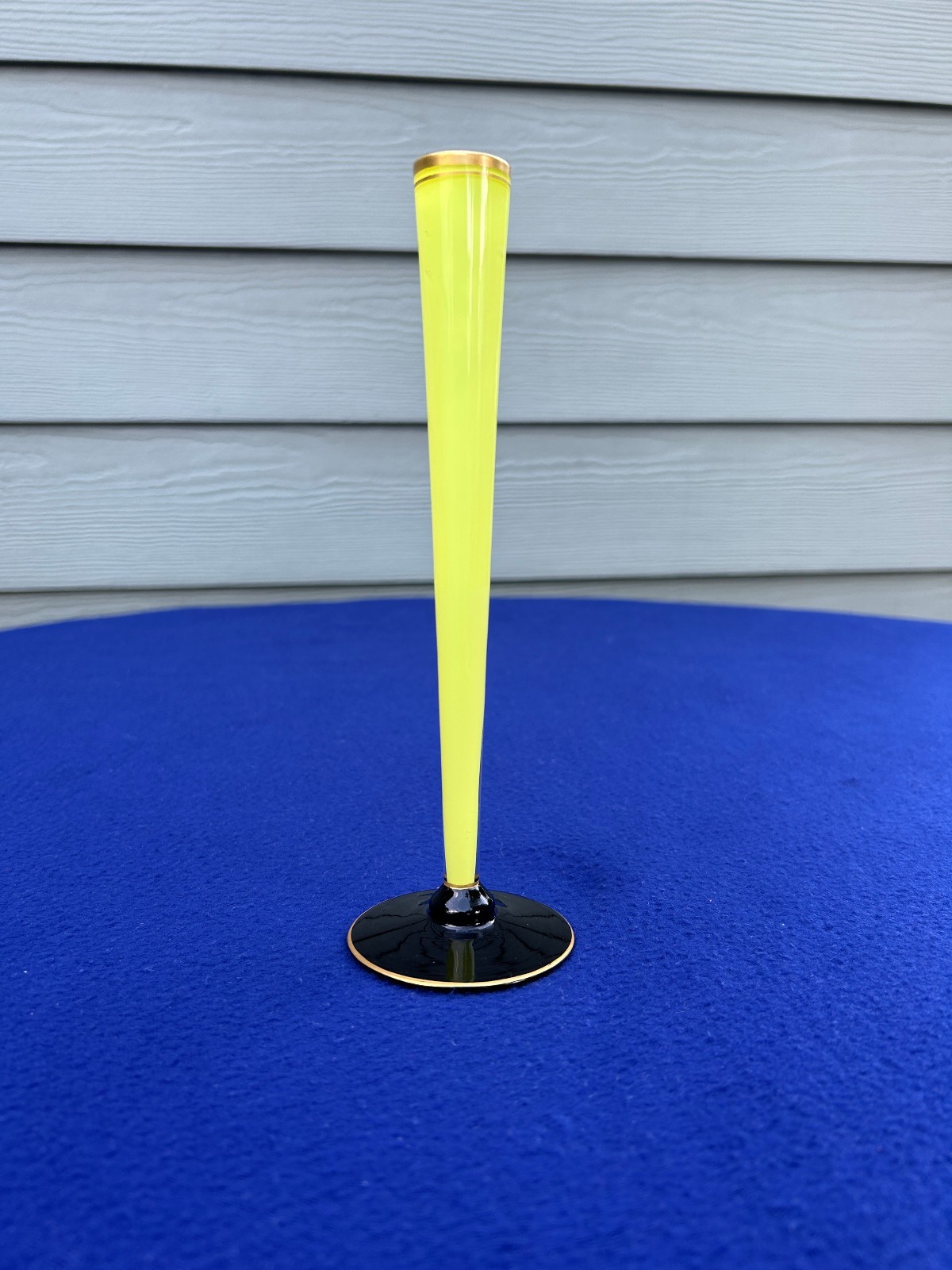 Striking early 20th Century Franz Welz or Harrach tango style bud vase 8" yellow with black base, gold trim on top and bottom.