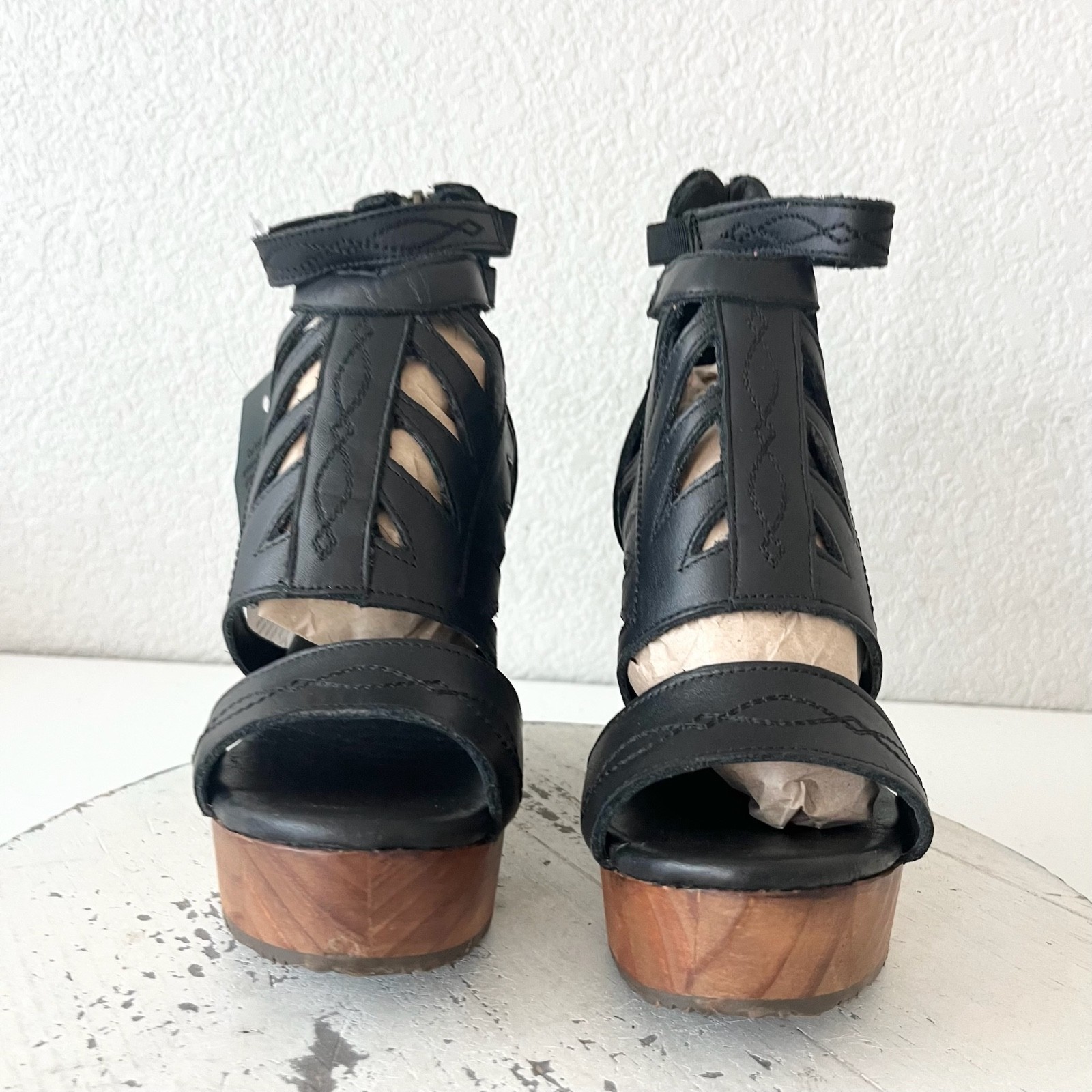 Condition: These are new wedges. The wood on the right shoe is a little lighter. They fit true to size and will come with a boot box. These are genuine leather. They have a zip closure and the ankle straps have elastic for comfort.