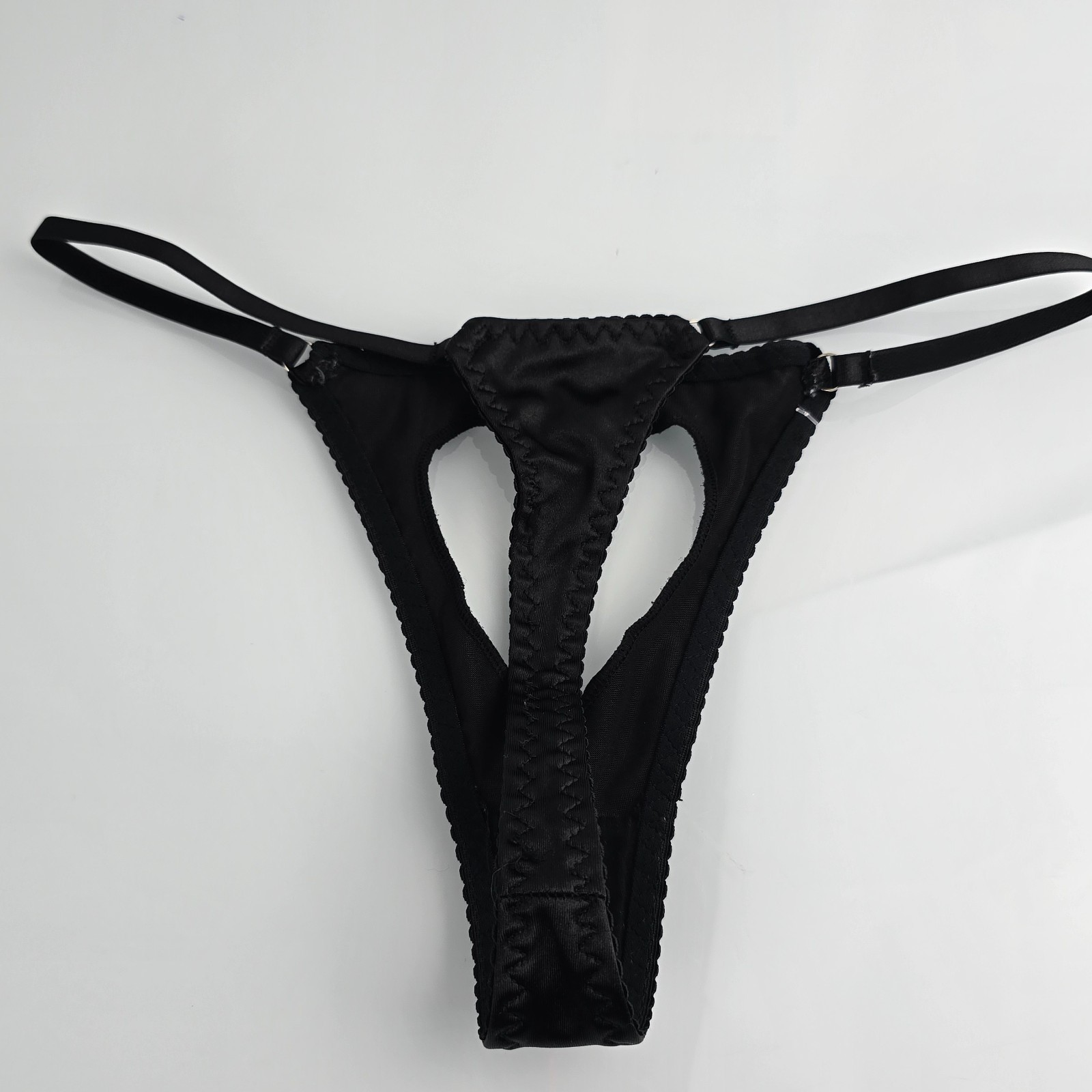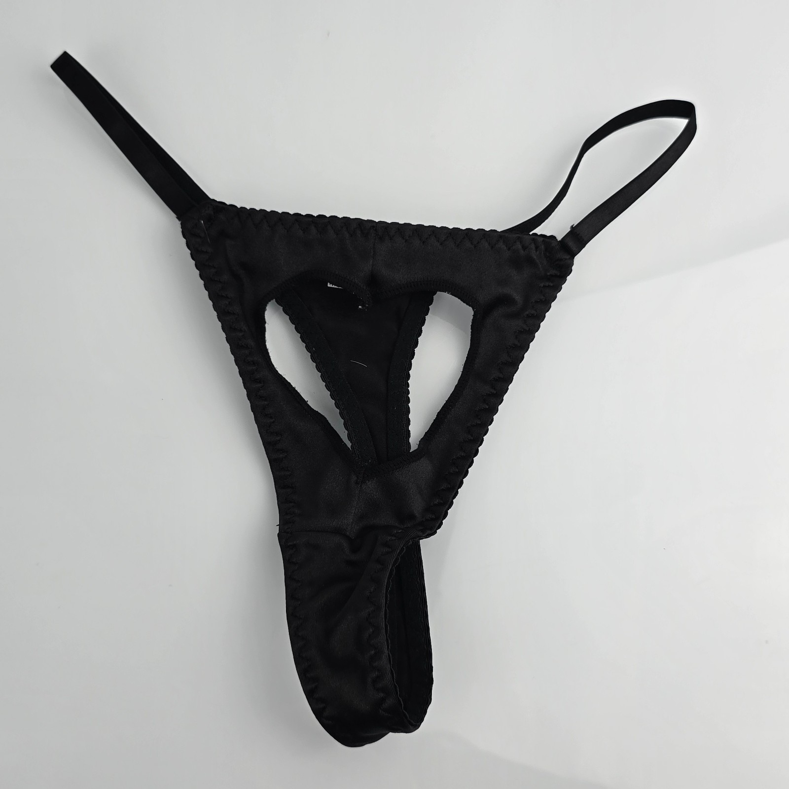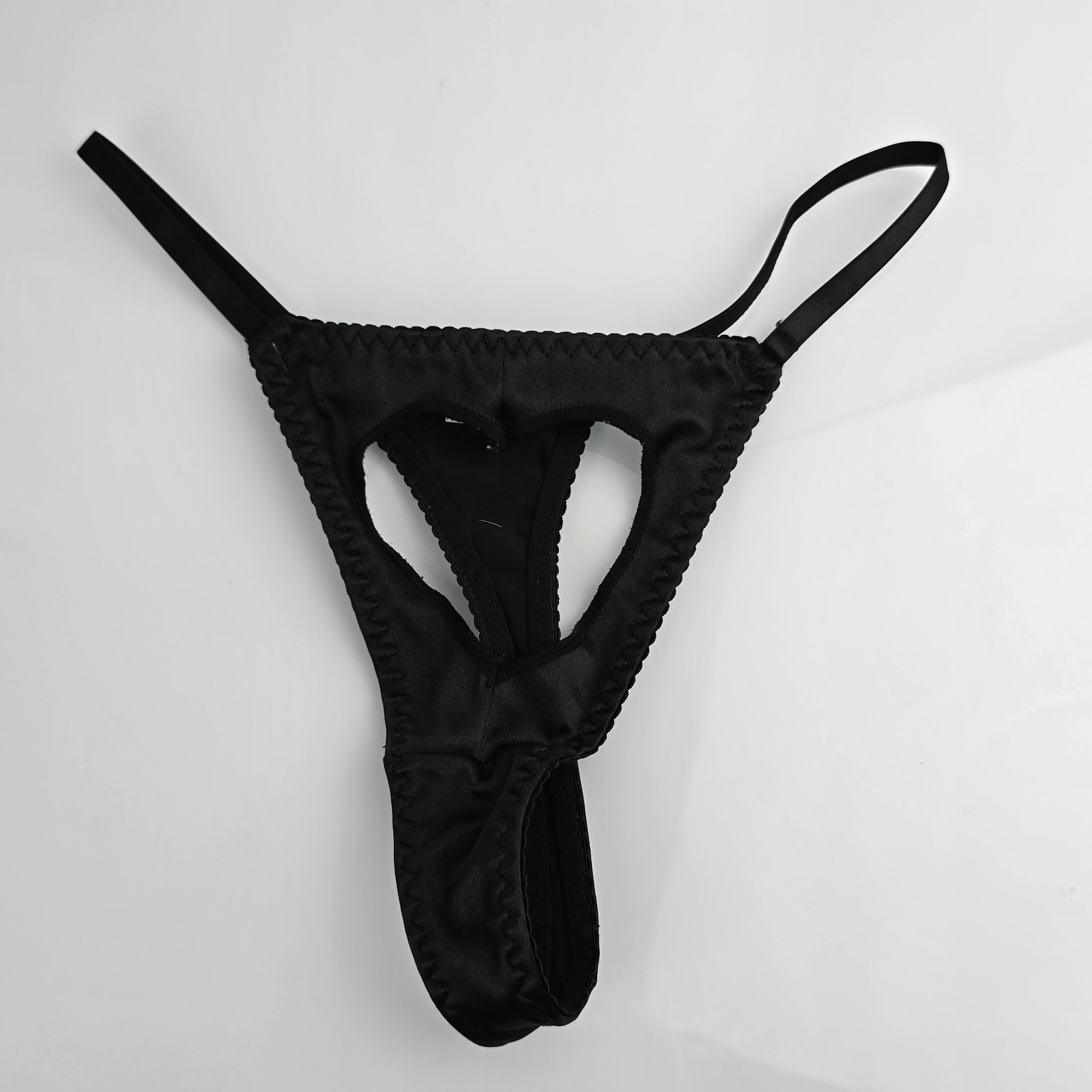 Glossy Smooth Second Skin Satin Black Heart Cut Out String Thong Panties L NEW