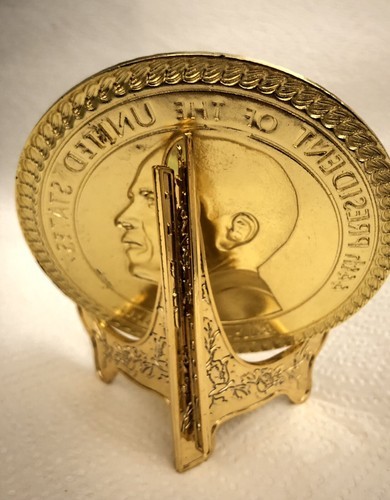 A 4? GOLD METAL WITH BLUE ENAMEL DISPLAY PLATE WITH HOLDER / STAND OR THIS CAN BE A WALL HANGING PLUS A 2009 INAUGURATION PIN FOR OBAMA BIDEN? RARE HARD TO FIND PLATE, BOX PIN ARE IN EXCELLENT NEW CONDITION. PLEASE VIEW MY OTHER LISTINGS FOR MORE INAUGURAL, PRESIDENTIAL, WHITE HOUSE ITEMS. FOR LINCOLN ROOSEVELT TRUMAN, KENNEDY, REAGAN BUSH CLINTON BUSH OBAMA TRUMP BIDEN?
