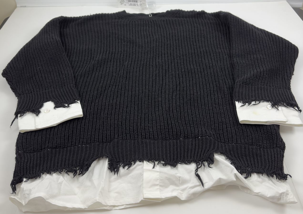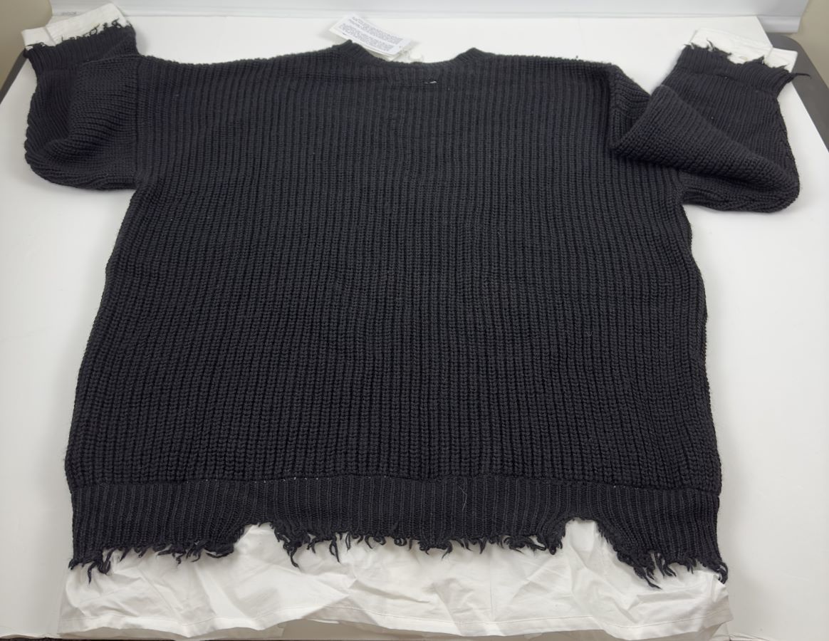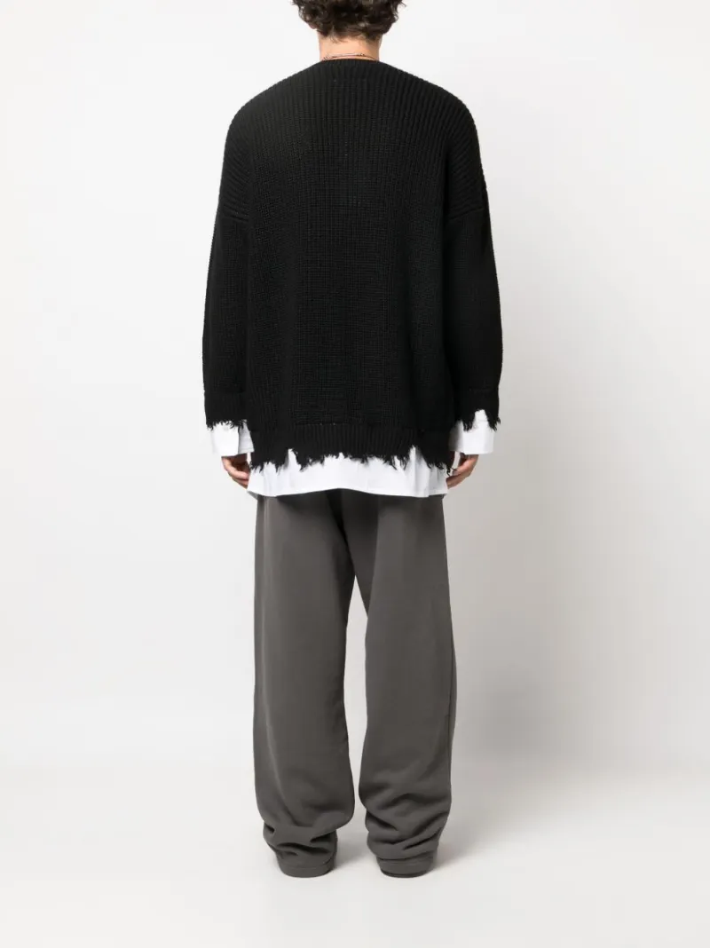 black/white waffle knit jersey texture layered design distressed finish contrasting border crew neck long sleeves curved hem