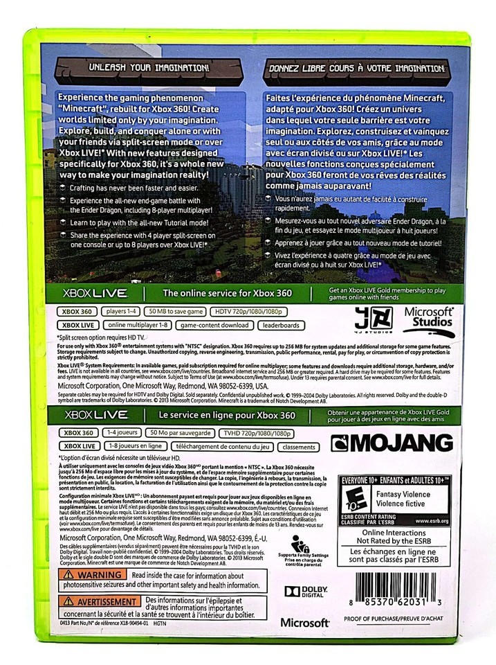 Minecraft: Xbox 360 Edition brings the popular sandbox game to Microsoft's console. Developed by 4J Studios and published by Mojang/Microsoft Studios, it features both single-player and multiplayer modes. Players can explore, craft, build structures, and survive in a blocky 3D world. The game supports split-screen co-op for up to 4 players locally and up to 8 players online. While no longer receiving updates, it remains a nostalgic favorite for many who enjoyed building and adventuring on the Xbox 360 platform.