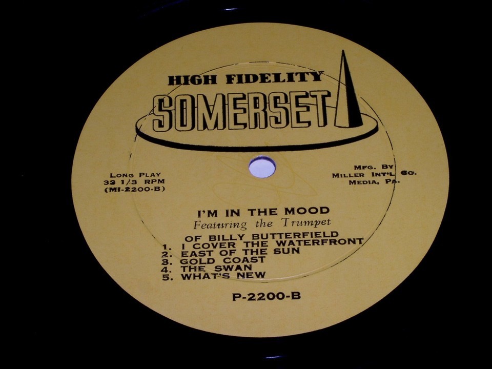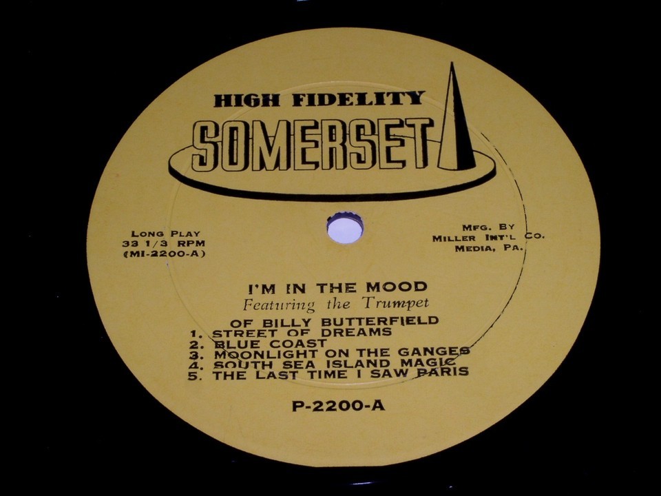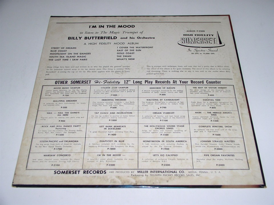 This is a vintage record album entitled, "Billy Butterfield and his Orchestra, I'm In the Mood". Record label Somerset P-2200 (Mono).