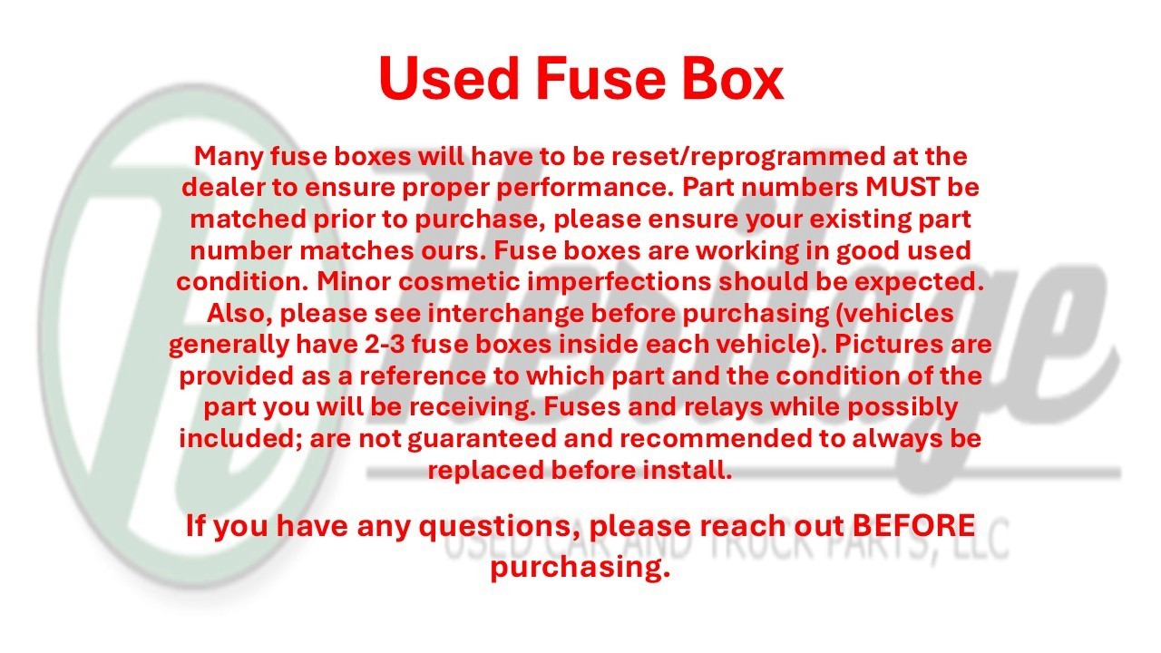 Some vehicles have different specs that must be matched to ensure fit. If you have any questions about if this part will fit your vehicle, please call or text 251-375-2135 Used Engine Fuse Box. Fuse boxes are working in good used condition. Part numbers MUST be matched prior to purchase. Minor cosmetic imperfections should be expected. Also, please see interchange before purchasing (vehicles generally have 2-3 fuse boxes under the hood.) Pictures are provided as a reference to which part and the condition of the part you will be receiving. Please read interchange carefully, and be sure your vehicle has the same options as this listed application. If you have any questions please ask us before purchasing!