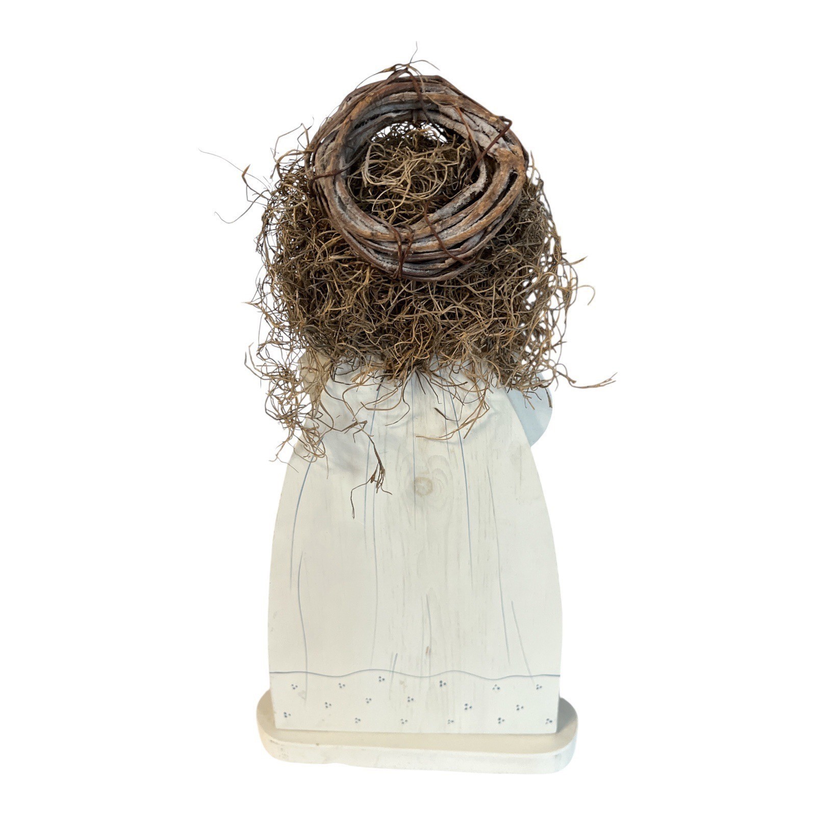 This charming hand-painted wooden angel was crafted and signed by artist **K. Moody** in 1995. The rustic folk art design features a cream-painted gown, hand-drawn detailing, a grapevine halo, and natural Spanish moss hair. The angel holds a small bouquet of blue flowers with green foliage, tied with a lavender ribbon.