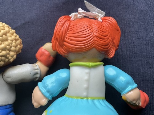 This is a lot of two vintage Cabbage Patch Kid figures. They are 1984 and bendable legs. They both are in good used vintage condition. The little girl is a rubbery plastic that is not like the harder PVC figure. Her legs are also not as bendable as the PVC figure. Both are in good used condition and great for a collection.