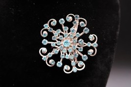Vtg Aqua Blue Prong Set Rhinestone Brooch Starburst Snowflake Brooch Silver Tone