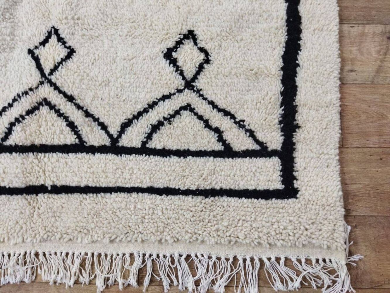 Handmade Vintage Moroccan Berber Rug | 5'1" 8'1" (158 cm 248 cm) | 1980s Authentic Berber Wool Rug from 1980s Morocco This vintage Moroccan Berber rug, handwoven in the 1980s, embodies the timeless artistry of Berber women from the Atlas Mountains. Crafted entirely from natural wool, it offers both tactile comfort and tribal elegance?with designs inspired by traditional motifs passed down through generations. Minimalist Geometry and Warm Earth Tones The rug reveals a balanced interplay between a light ground and bold geometric patterning in deep black. Its minimalist design highlights linear diamond shapes and tribal symbols. The woven structure showcases subtle variations in pile height and texture, adding visual interest and authenticity to the piece. Supreme Comfort Meets Collectible Charm At a generous 5'1" 8'1" (158 cm 248 cm), this rug is as practical as it is beautiful. The soft wool surface is both luxurious and durable?ideal for high-traffic areas or grounding a serene interior. With its vintage lineage and rustic sensibility, it blends effortlessly with modern, bohemian, or minimalist decor. Key InformationMaterial: 100 % wool, hand-wovenOrigin: Morocco, Atlas Mountains Berber traditionAge: 1980sDesign: Black geometric motifs on light wool groundCondition: Excellent vintage condition; well preservedSize: 5'1" 8'1" (158 cm 248 cm)Use: Functional accent rug, design centerpiece, collectible Berber textile