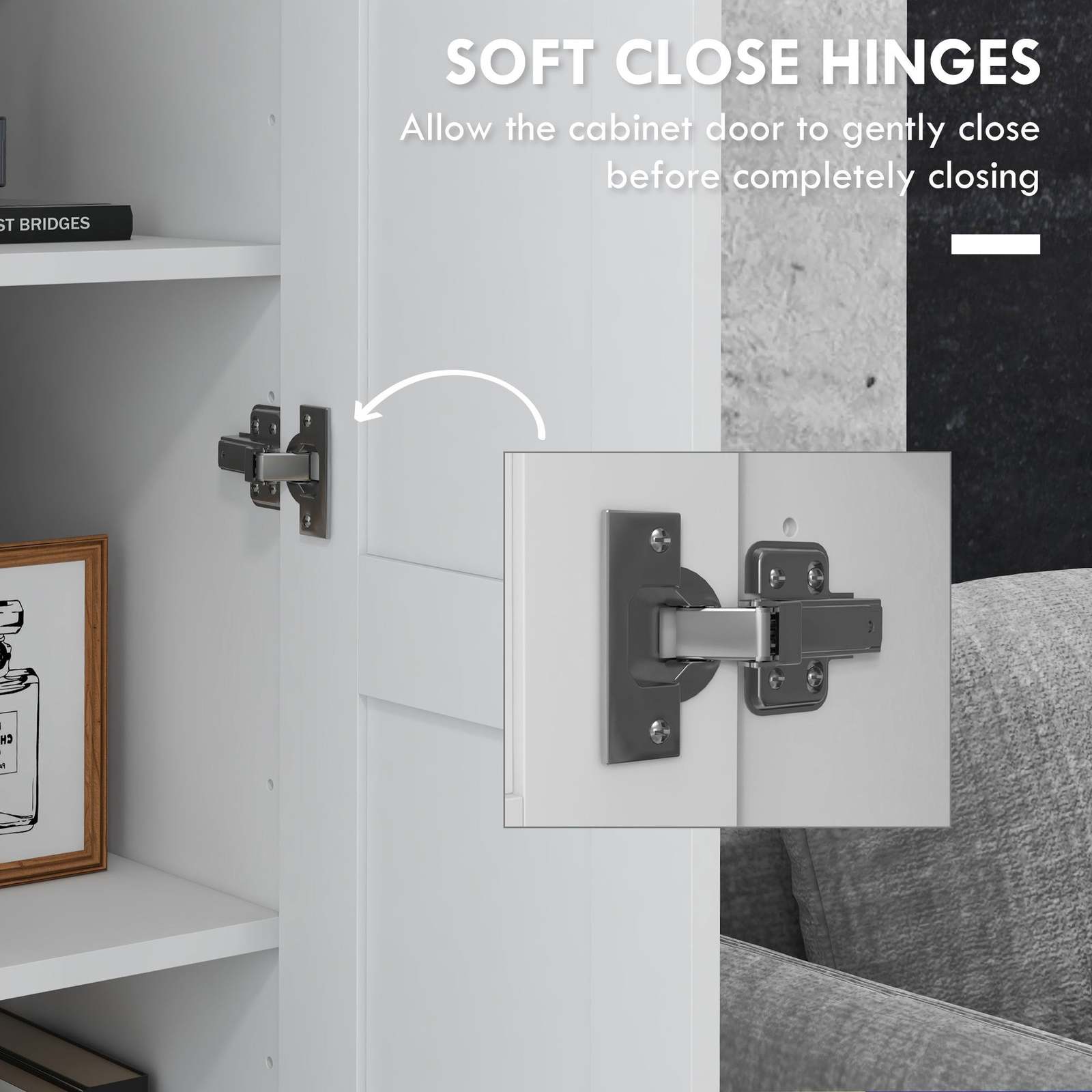 Soft Close Doors: Say goodbye to slammed doors and pinched fingers with smooth, whisper-quiet self-closing mechanisms. Keep organized behind the door of the kitchen storage cabinet, so your items stay safe and dust-free.