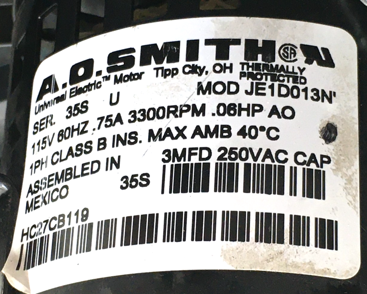 This is A.O. SMITH JE1D013N Carrier Bryant Draft Inducer Blower Motor HC27CB119 115V 3300 RPM .06HP used part.