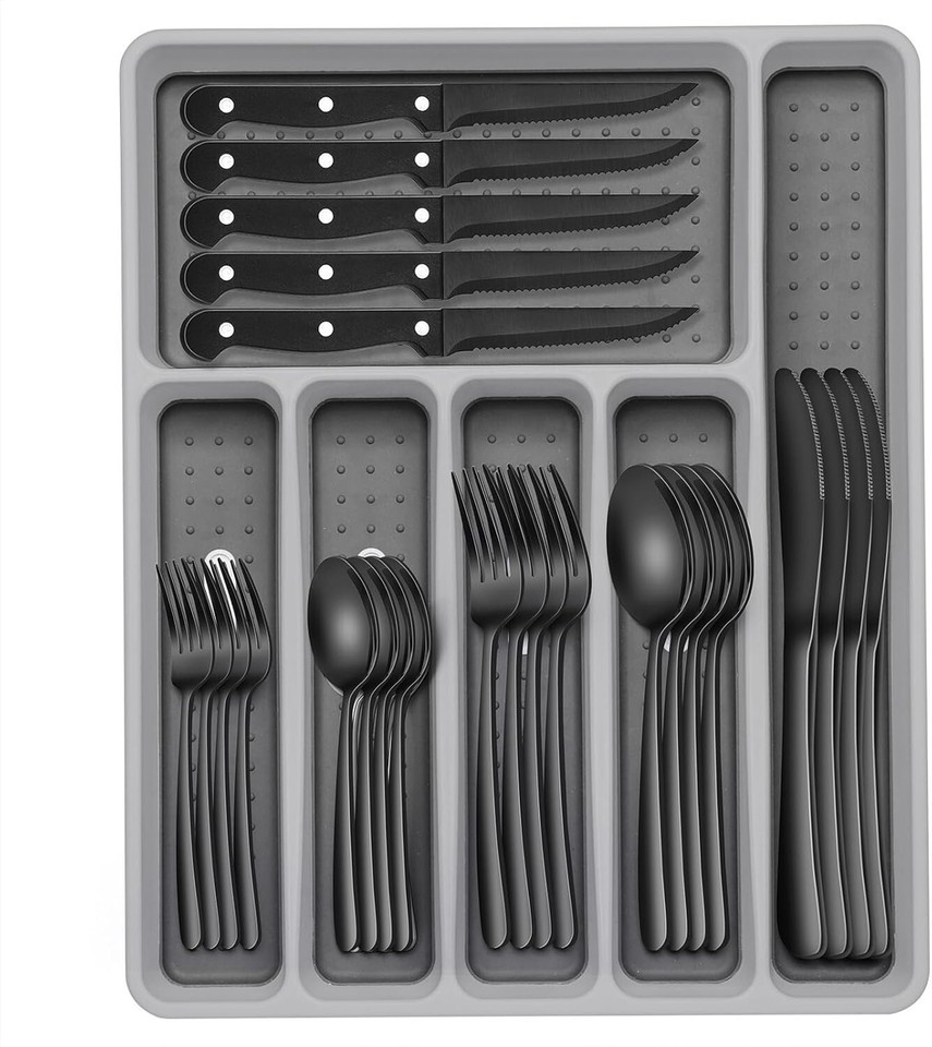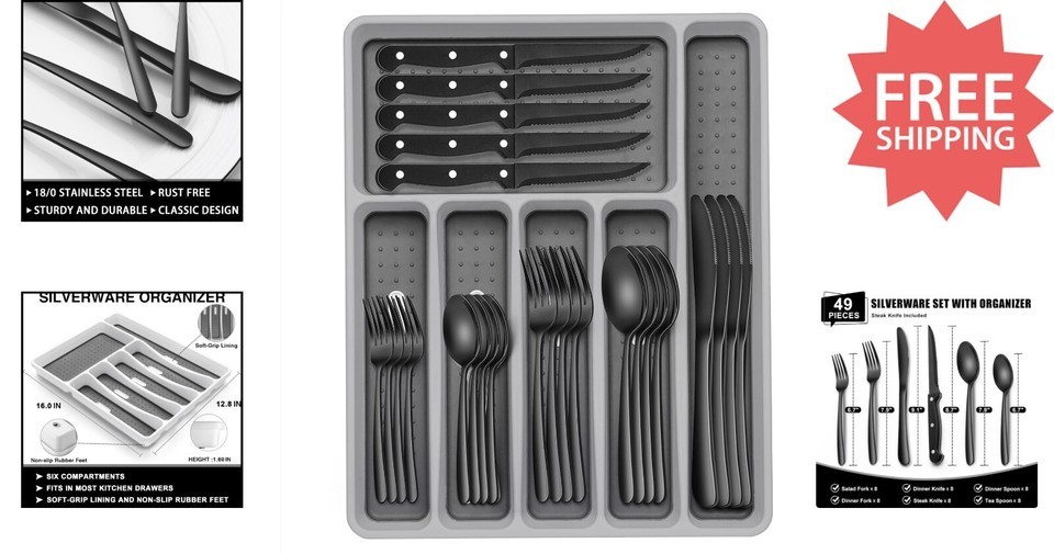 Rust-Proof Black Flatware Set for 8 with Organizer - 49-Piece Collection