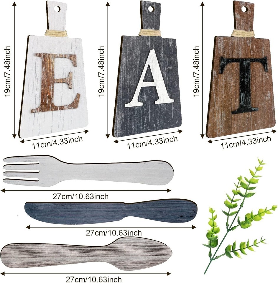 Enhance your kitchen decor with this charming set of rustic wooden signs. Featuring a delicate cutting board-shaped sign adorned with green leaves and classic utensils?fork, spoon, and knife?this wall art warmly welcomes family and friends into your space. Each piece measures approximately 19 x 11 cm or 11.81 x 2.4 inches, perfectly coordinating with your existing decorations. Crafted from high-quality, durable wood with a smooth, polished finish, these signs are built to last without fading or deforming. The package includes six pieces: three cutting board signs, three utensil signs, and one green leaf accent, ideal for decorating your kitchen, dining area, living room, hotel, or restaurant. To ensure fast and reliable delivery, we work with multiple fulfillment partners and suppliers. Depending on availability and location, your order may ship from different warehouses or arrive in packaging that varies from item to item. Tracking details are typically provided shortly after shipment, and customer satisfaction remains our top priority. Please note that due to carrier policies and regional regulations, certain items may not be eligible for delivery to specific states or territories.