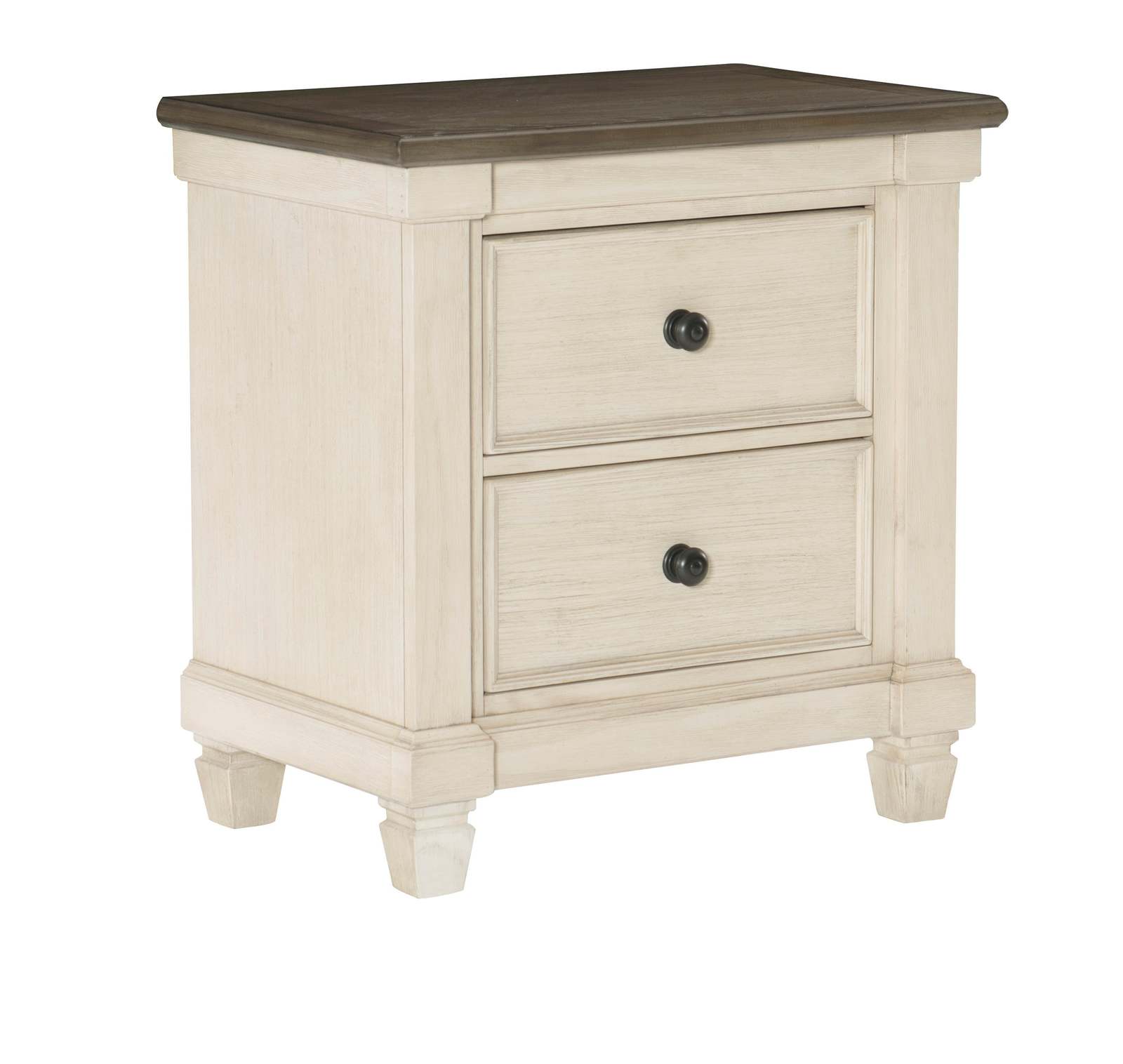 Transitional-rustic styling is expertly achieved in the design of the Weaver Collection. Antique white provides bold contrast to the rosy brown plank-style tops, with pine solids and oak veneer further lending visual texture to the nightstand. Classic framing paired with dark metal knob hardware complete the rustic look.