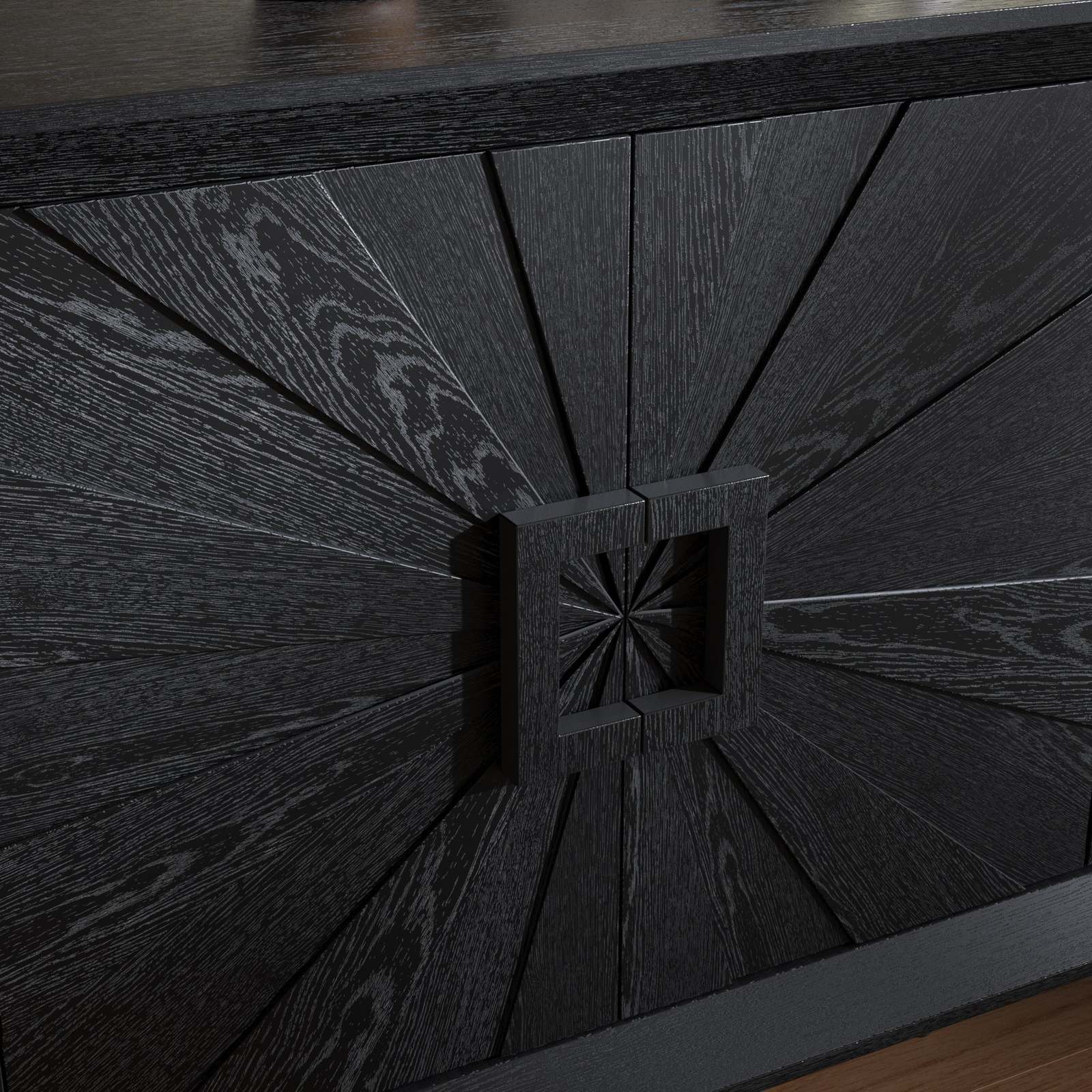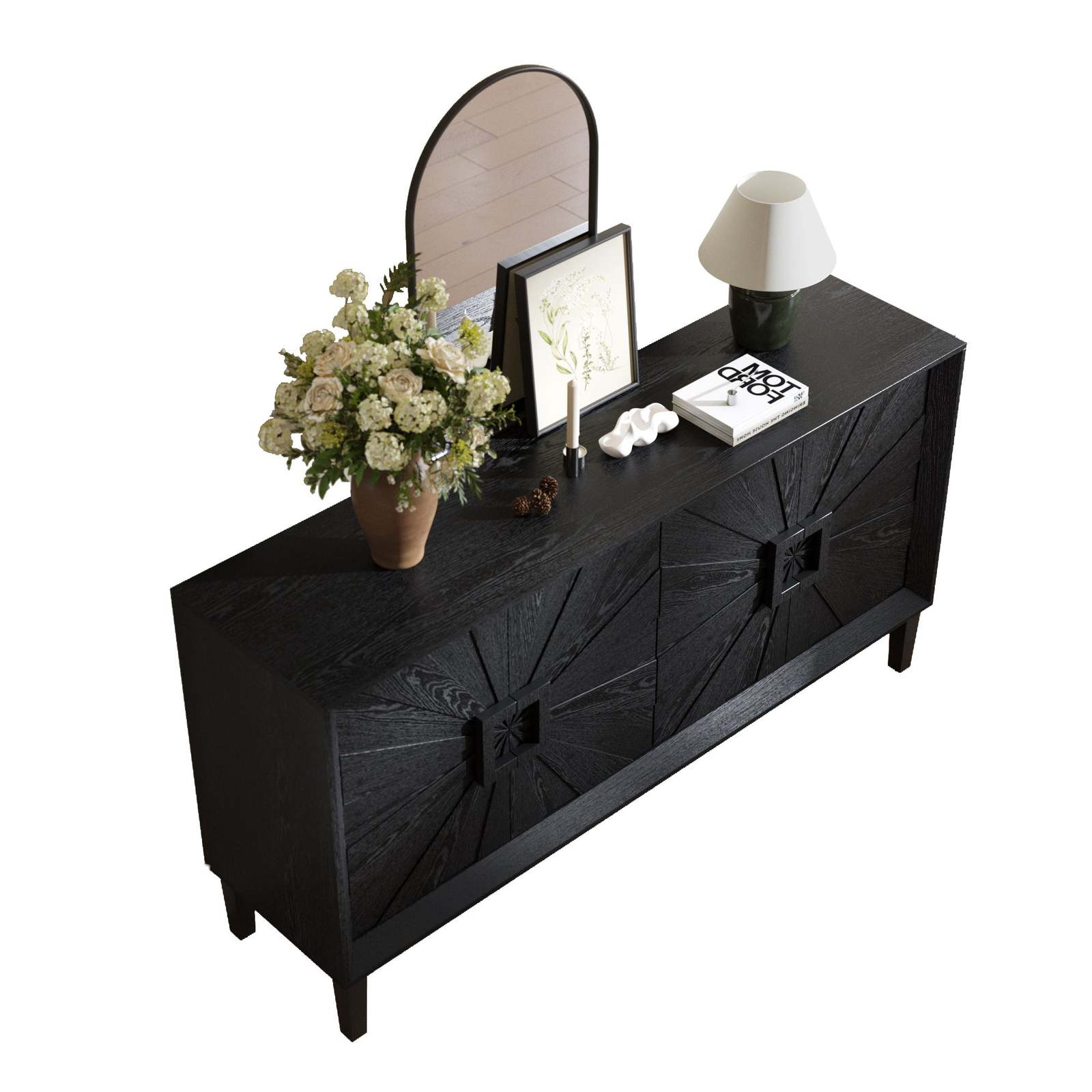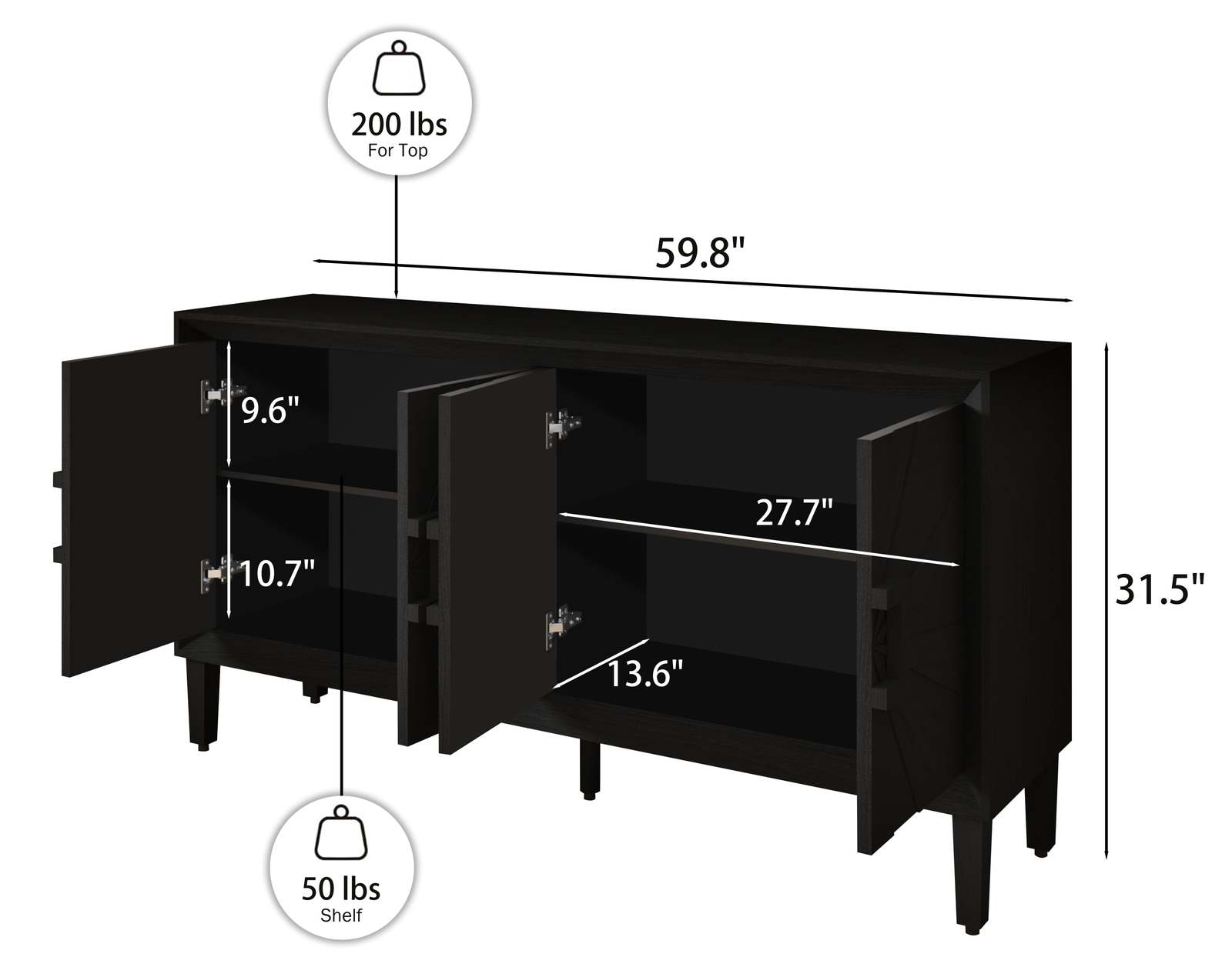 Elevate your space with the 60' Black Farmhouse Credenza, a striking fusion of rustic charm and modern sophistication. Featuring a symmetrical sunburst door design crafted from premium black wood panels, this heavy-duty TV stand delivers both artistry and durability. The rich rustic black wood finish enhances its distressed texture, while the modern black storage cabinet (60'L ?32'H ?15.8'W) boasts a 200lbs weight-bearing top and three adjustable shelves (50lbs each) for organizing media, kitchenware, or d cor. Raised 6.69' on sturdy legs, it offers under-cabinet storage and complements farmhouse or contemporary interiors. Built with anti-tip anchors, scratch-resistant surfaces, and smooth-gliding doors, this credenza merges safety, functionality, and bold American farmhouse aestheticsa??perfect as a statement TV console, kitchen buffet, or living room centerpiece.