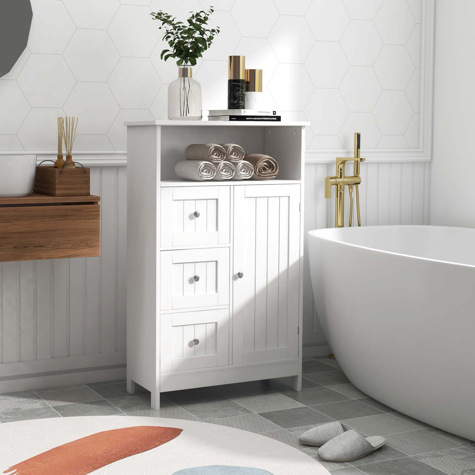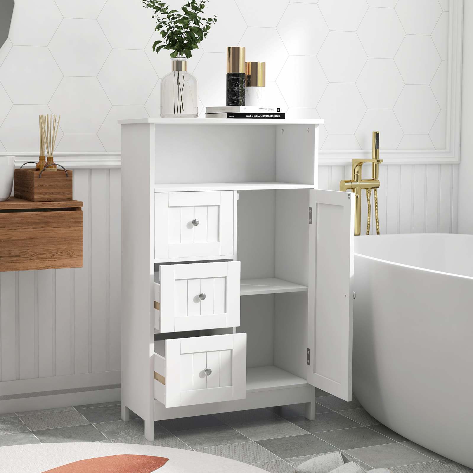 White Bathroom Storage Cabinet: Standing Unit with Drawers & Door