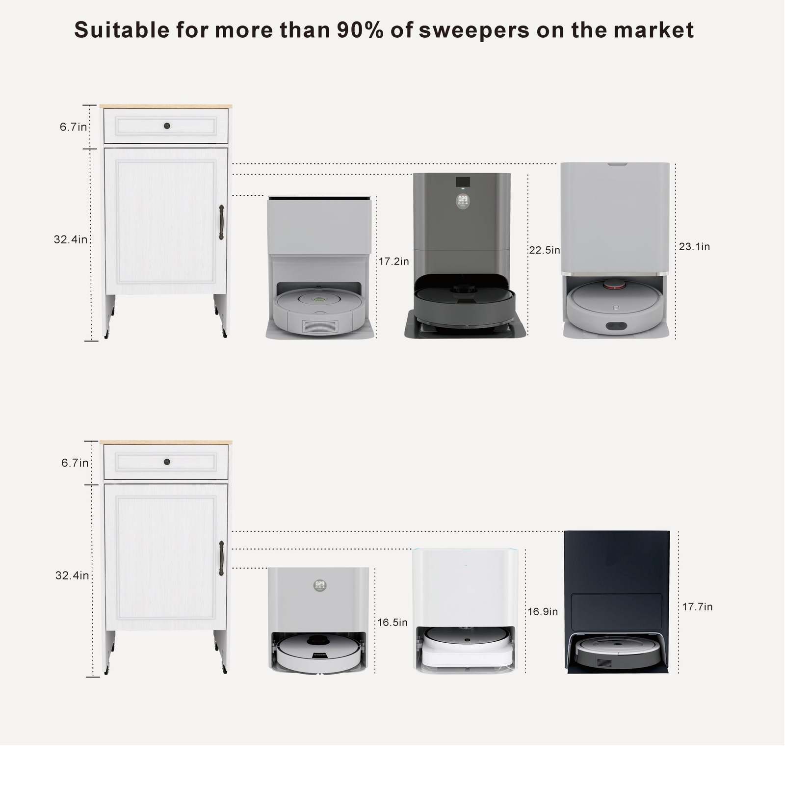 More stable: There are adjustable height reinforcement plates at the front and back of the cabinet, making it less prone to tipping over during use. The front wooden board can be adjusted by 2 heights, and the rear wooden board can be adjusted by more heights to accommodate different sizes of sweeping robots.