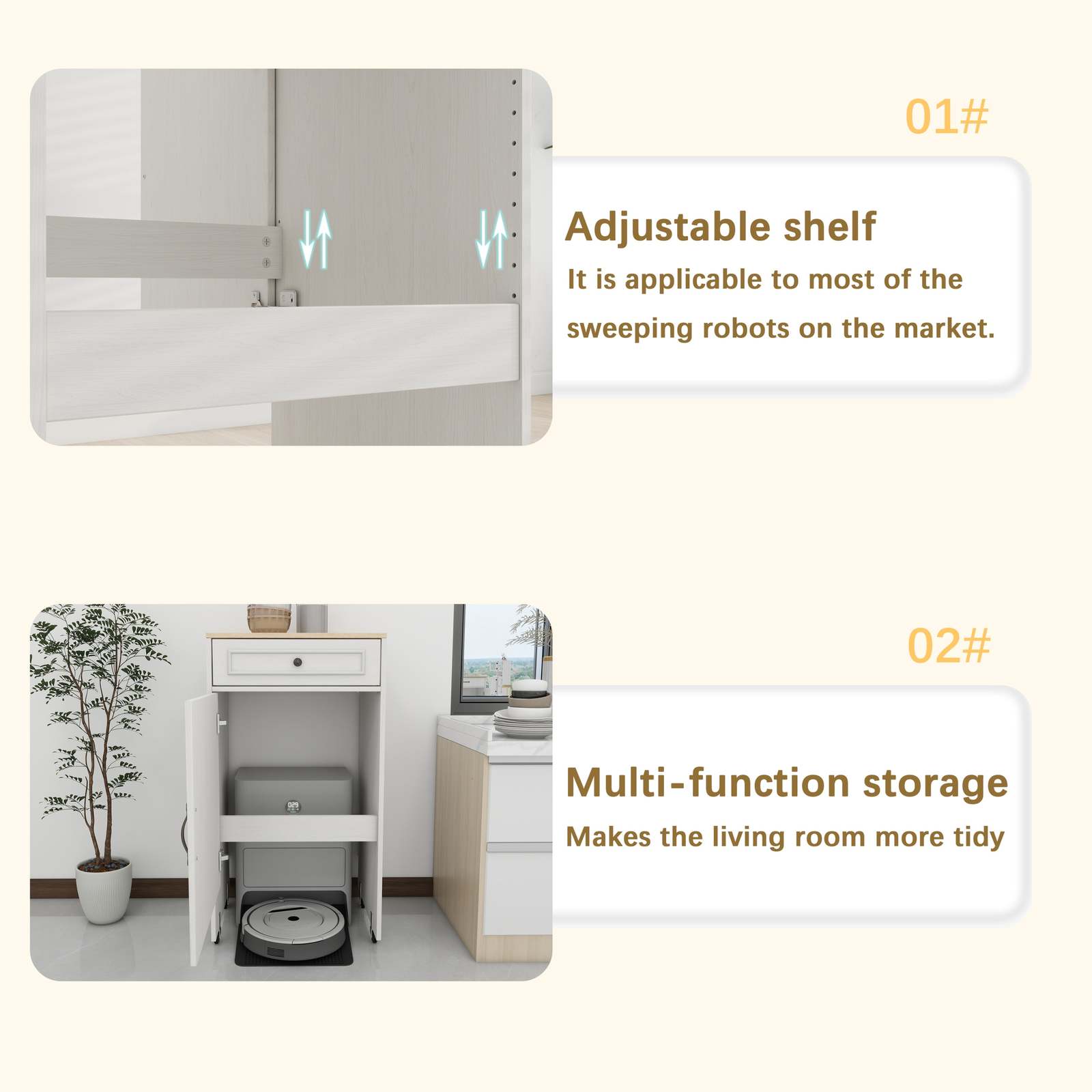 Ample storage space: This cabinet designed with multiple storage zones, including a top surface for display, a drawer for small items and a lower cabinet with doors to neatly hide your robot vacuum when not in use.