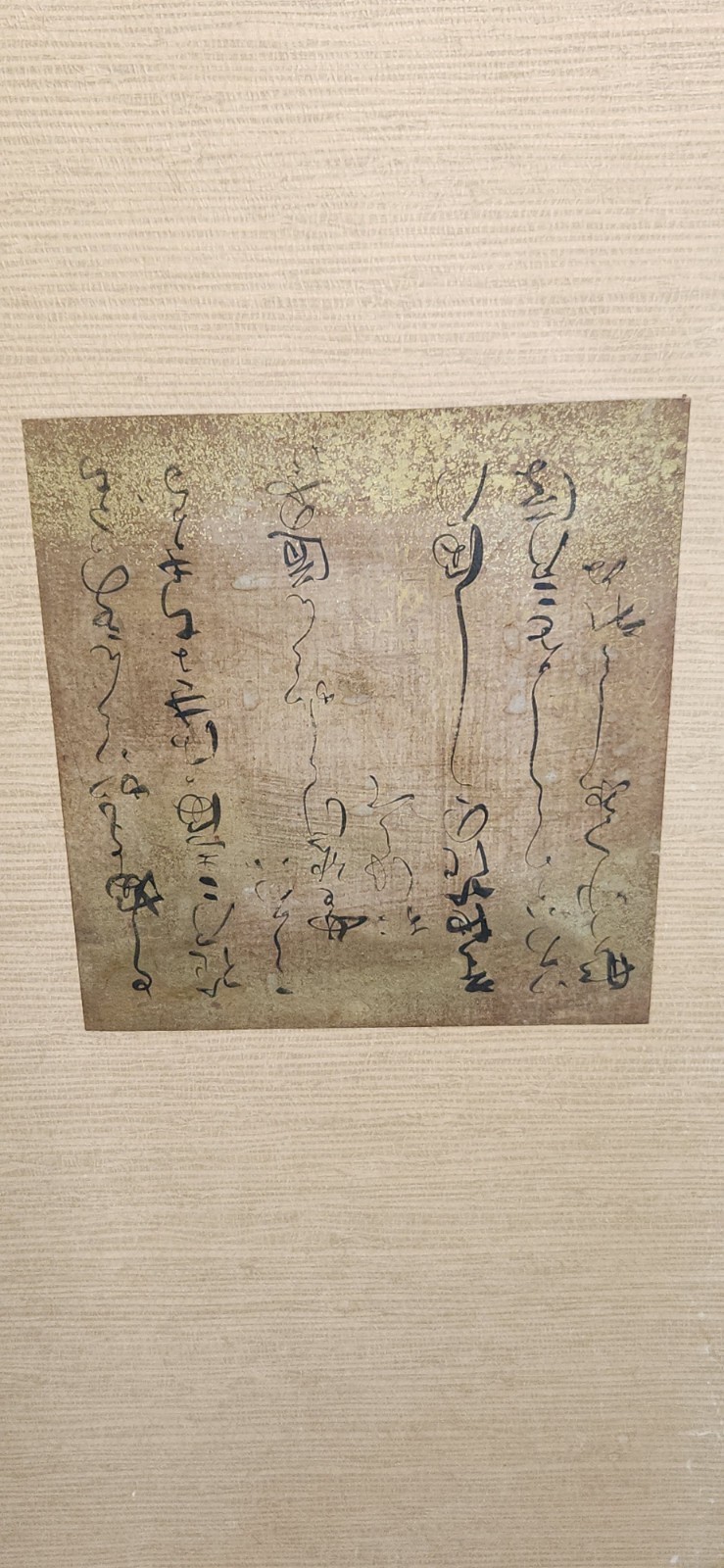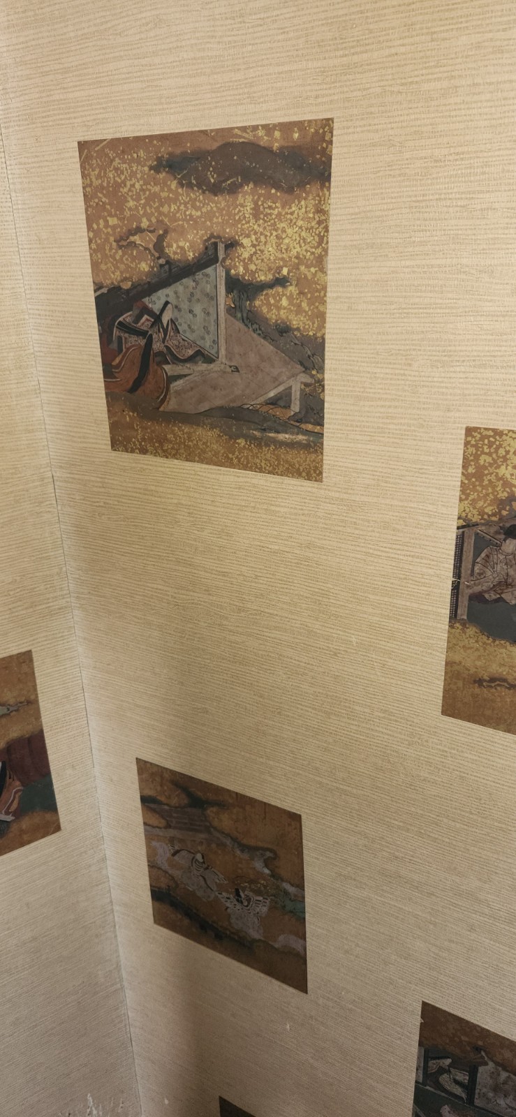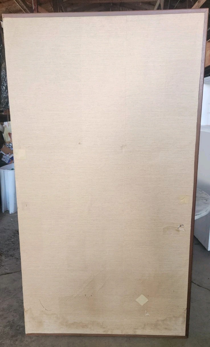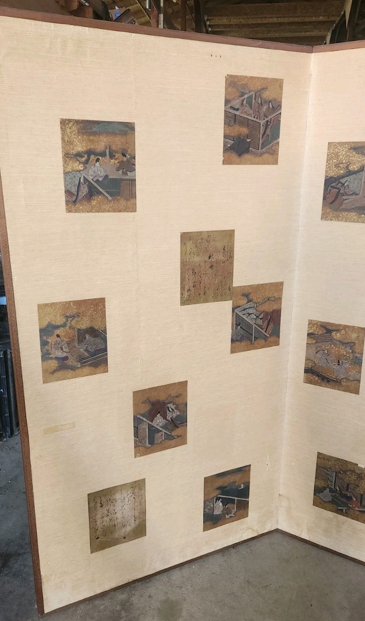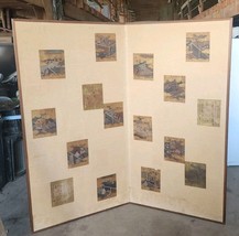 Here is a neat vintage Oriental screen room divider. 2 panel. Age is unknown. We know nothing about this piece. Picked up from an estate. Not sure if it is silk or not. has wear issues. Some tears and a few holes in places. Measures 74.5 inches wide when open. 67.75 inches tall. Has neat square pieces applied to it. Can be picked up locally to save on shipping.