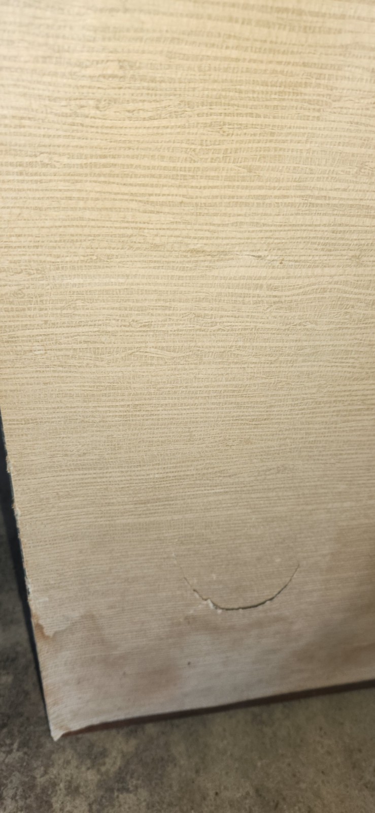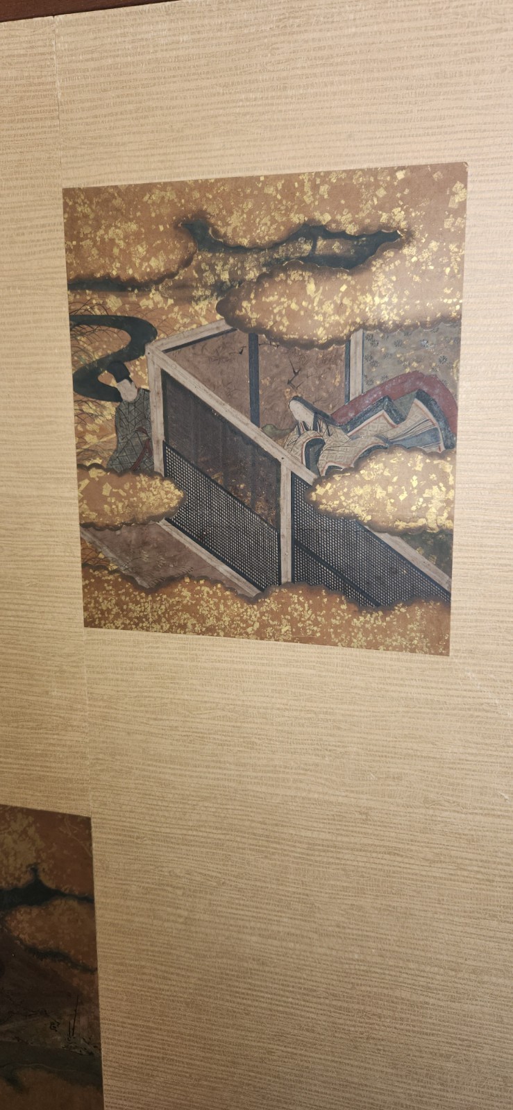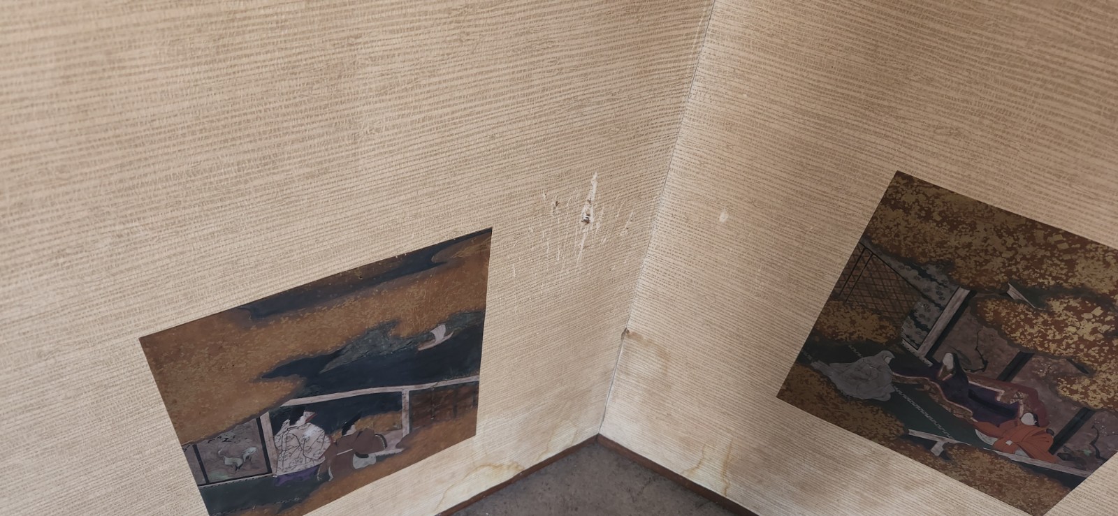 Here is a neat vintage Oriental screen room divider. 2 panel. Age is unknown. We know nothing about this piece. Picked up from an estate. Not sure if it is silk or not. has wear issues. Some tears and a few holes in places. Measures 74.5 inches wide when open. 67.75 inches tall. Has neat square pieces applied to it. Can be picked up locally to save on shipping.