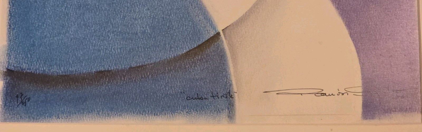 This is an original and signed art print by Cuban artist Ramon Unzueta, produced in 2001 in Miami, Florida. The medium-sized painting on paper titled "Cuba Triste" features contemporary and Cuban influences, depicting figures in a multicolor palette using pastel production techniques. The piece is signed by the artist and numbered 97 out of 250, matted and framed. Item is in good condition as displayed in the photo gallery. A great addition to a to any art collection. The artwork does not come with a certificate of authenticity besides the info on the back of the print by the late artist.