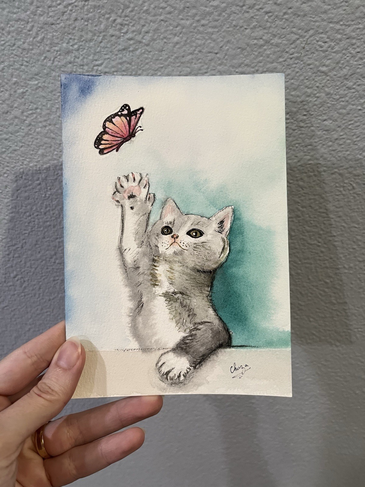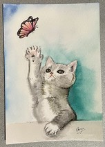 Original Hand painted watercolor painting of a Cat Chasing A Butterfly