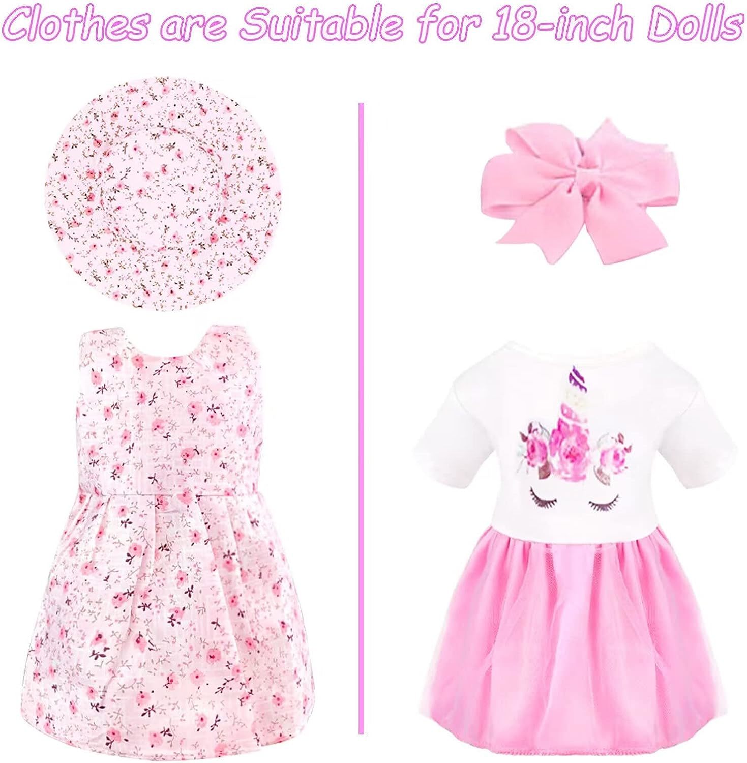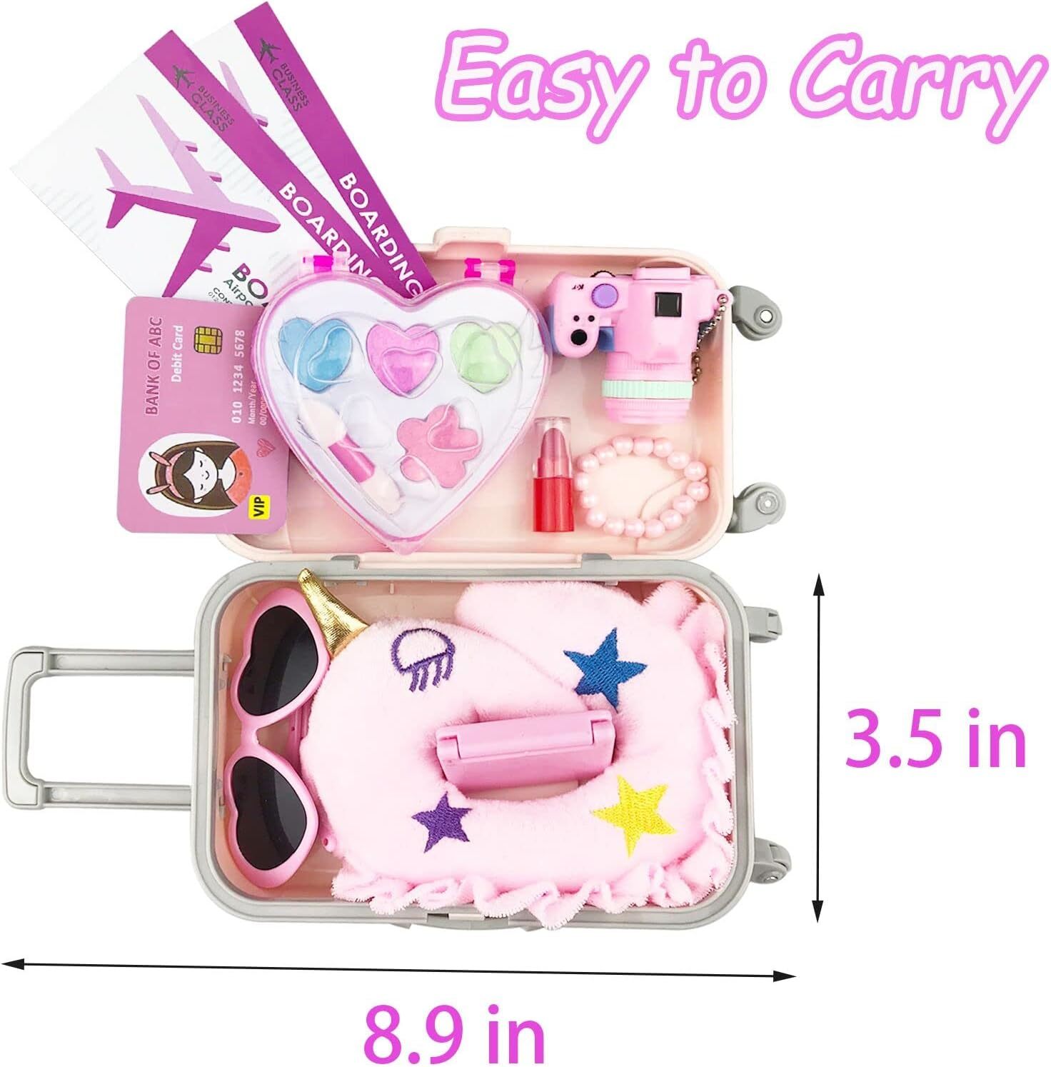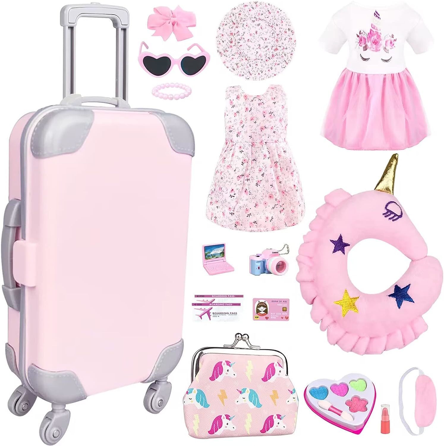 ?17Pcs Doll Clothes and Accessories: Suitable for 18 inch Dolls. We provide a full set of doll travel sets, including 2x Doll Clothes, 1x Luggage, 1x Hat, 1x Travel Pillow, 1x Doll Purse, 1x Computer Toy, 1x Camera Toy, 1x Pink Sunglasses, 1x Doll Hair Clip, 2 x Doll Pretend Makeup Toy, and other cute 18 inch girl doll accessories. ?Doll Shoes Not Included? ?Portable Travel Luggage: Designed with rotating wheels and adjustable handle, the dolls case can be moved up and down, just like real. Made of high quality and durable materials, it can be easily opened and closed. It measures 3.5x1.7x8.9 inches, and most of the doll accessories can be easily stored in the doll case. (Fit 18 Inch Girl Doll) ?Ideal Girl Gift: This unique 18 inch doll clothes and accessories travel luggage play set is the perfect addition to your 18 inch doll. Perfect for kids Birthday gifts, Childrens Day, Christmas gifts, New Year gifts, party favors and other holiday gifts, especially for little girls aged 3, 4, 5, 6, 7, 8 years old. ?Premium Quality: Made of high quality materials, safe for children, smooth edges, comfortable to touch, practical, durable and child-friendly. ?Application Occasion: Girls can dress up their 18-inch dolls from head to toe with these plentiful girl doll stuff. Through the game, you can encourage good self-management habits by encouraging your child to unpack or list the items needed for the trip.