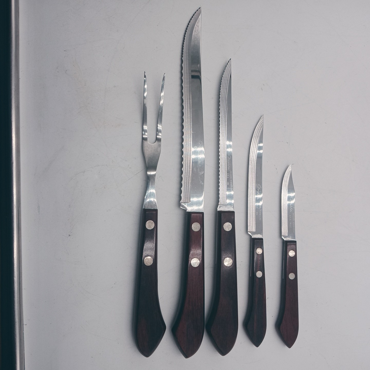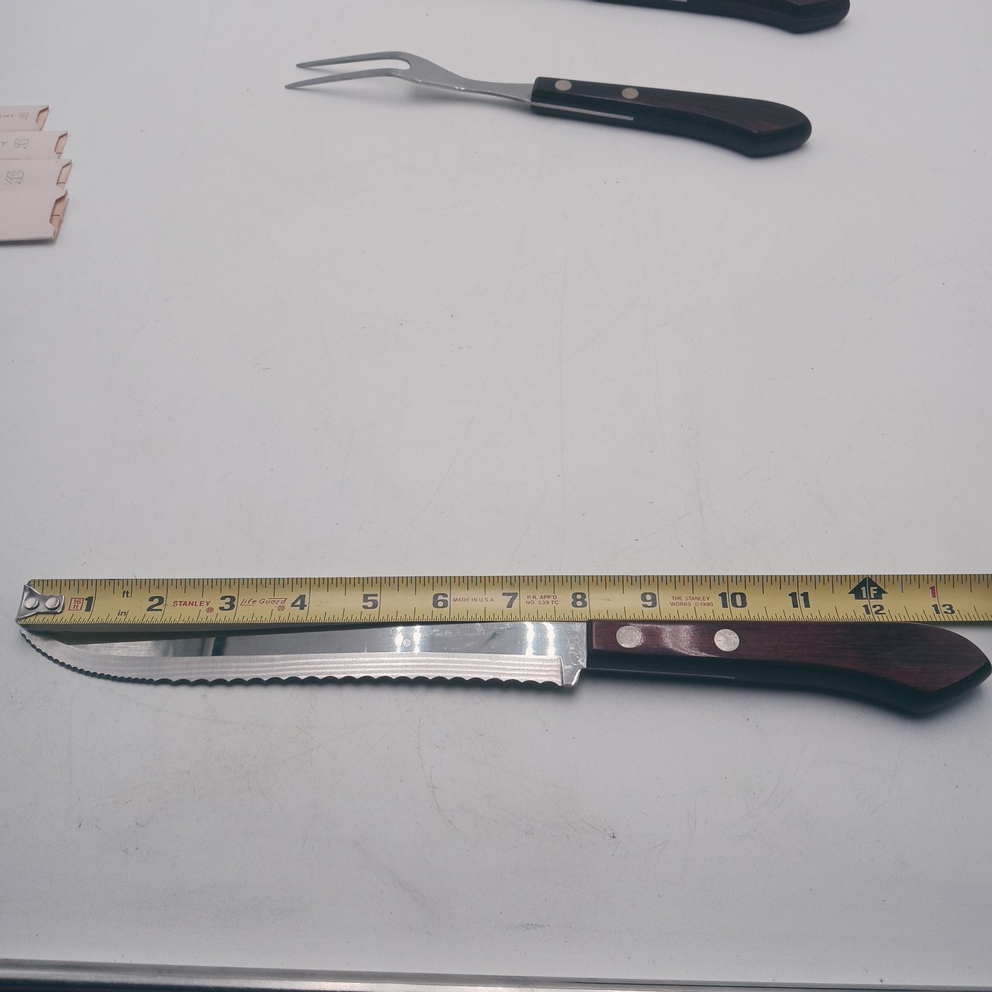 Four knives and one carving fork. Great as a gift or replacement set. Very good condition.