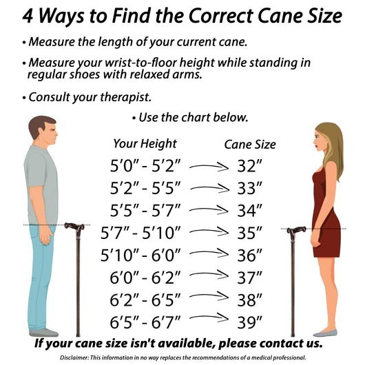 CHOOSE THE CORRECT LENGTH TO AVOID SPINE PAIN. Asterom Canes are available in lengths from 32" to 39", and these are the only canes of solid construction (unlike rattling, unsturdy folding aluminum canes). Choose the proper cane length according to your height and avoid spine pain due to incorrect posture. To choose the correct length, use our size chart or ask your therapist.