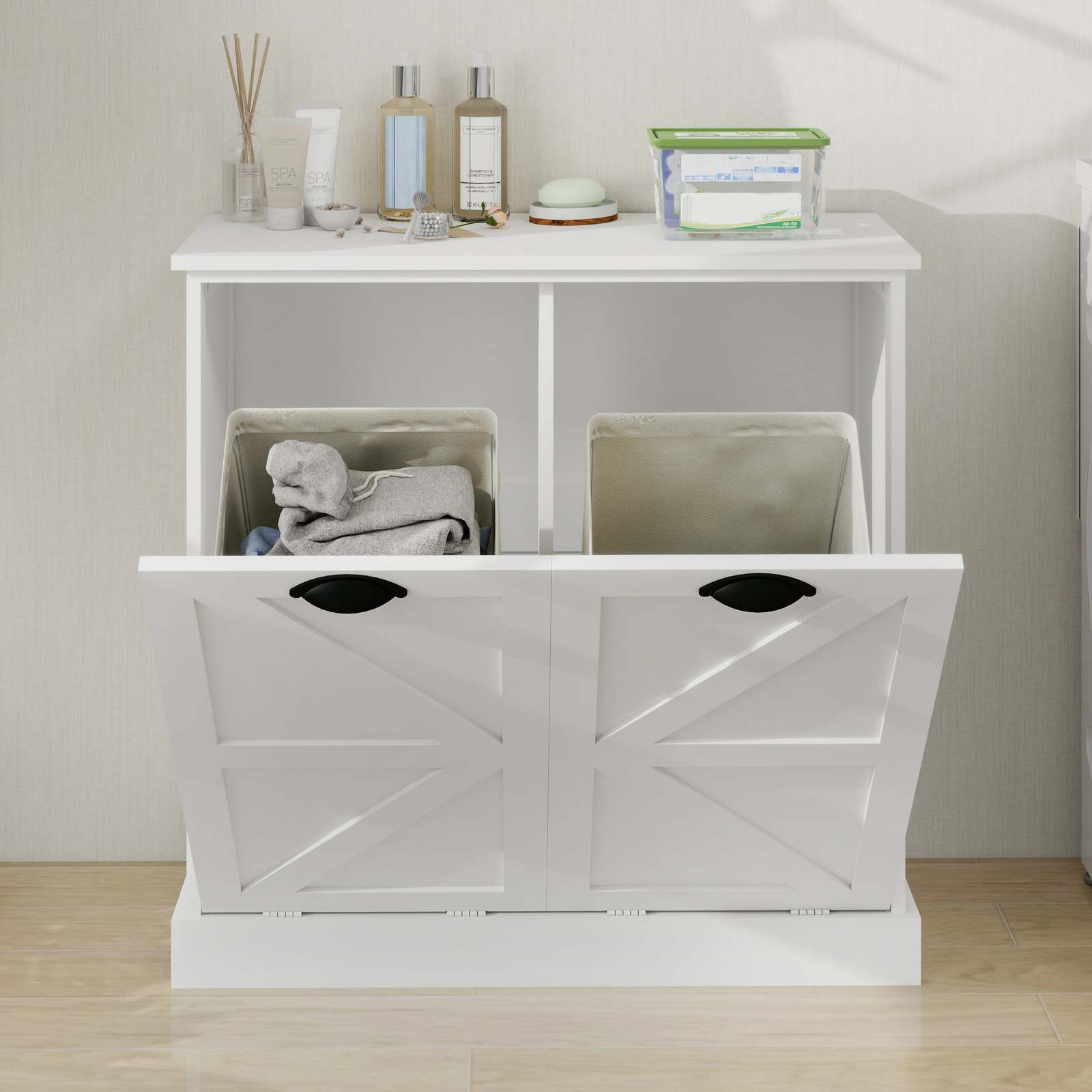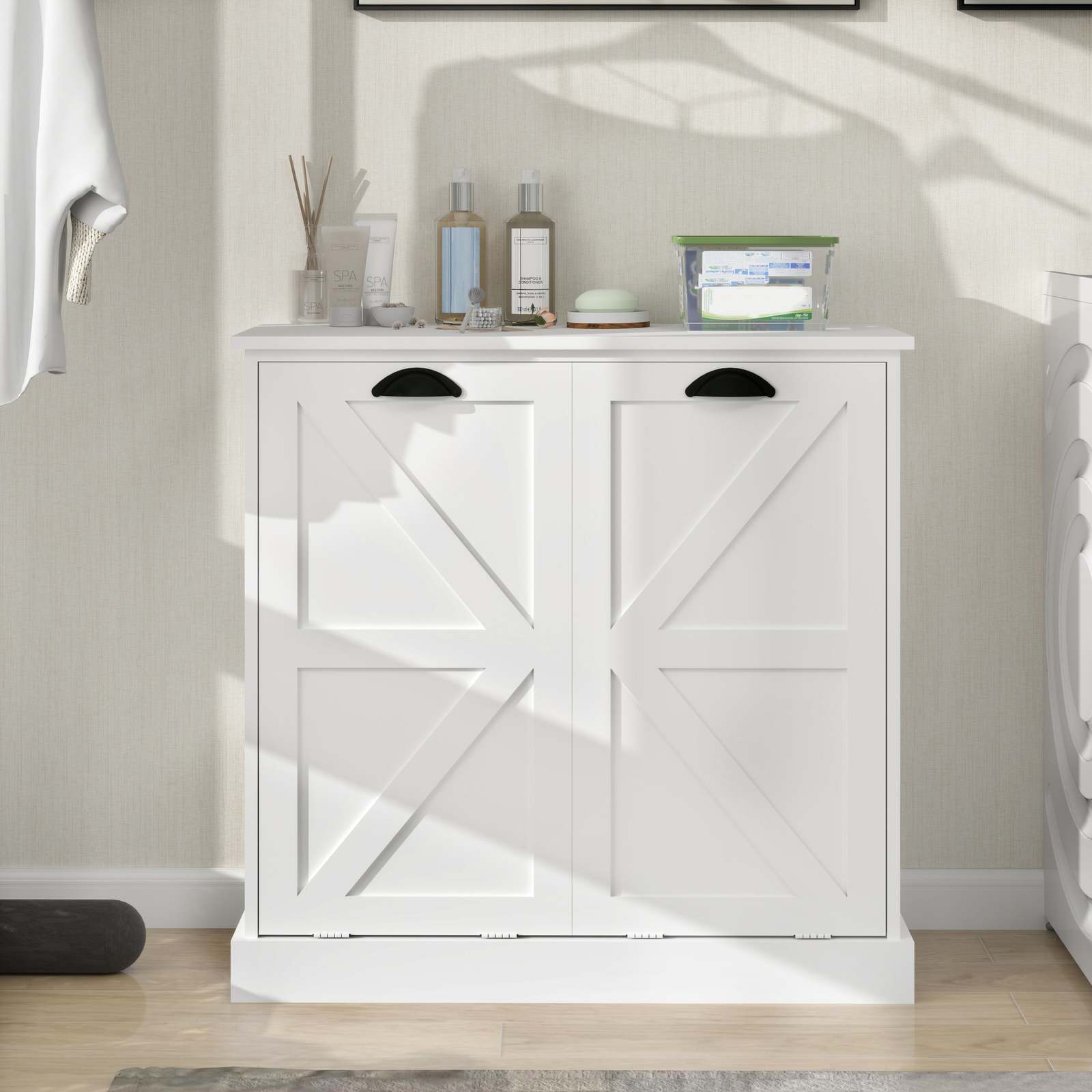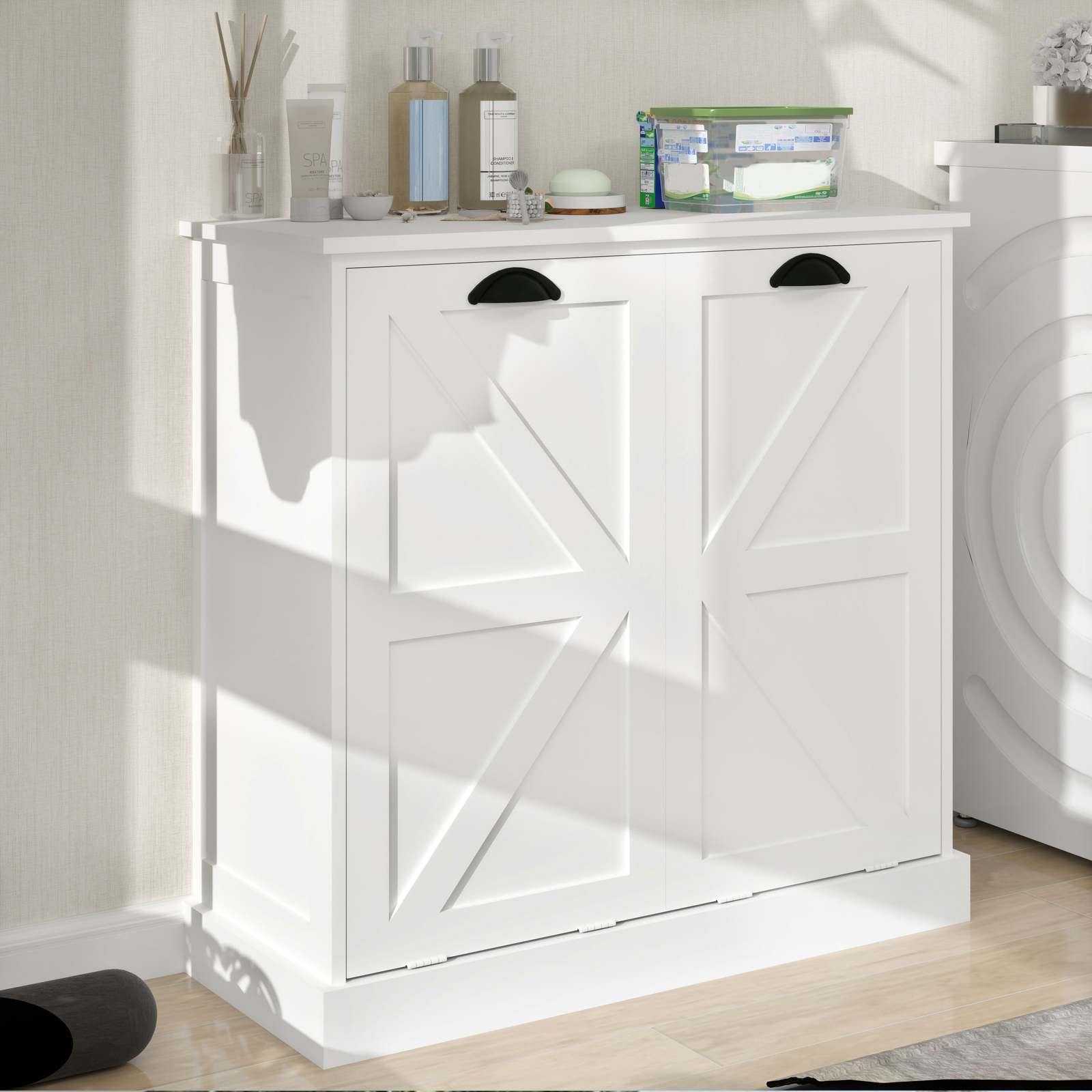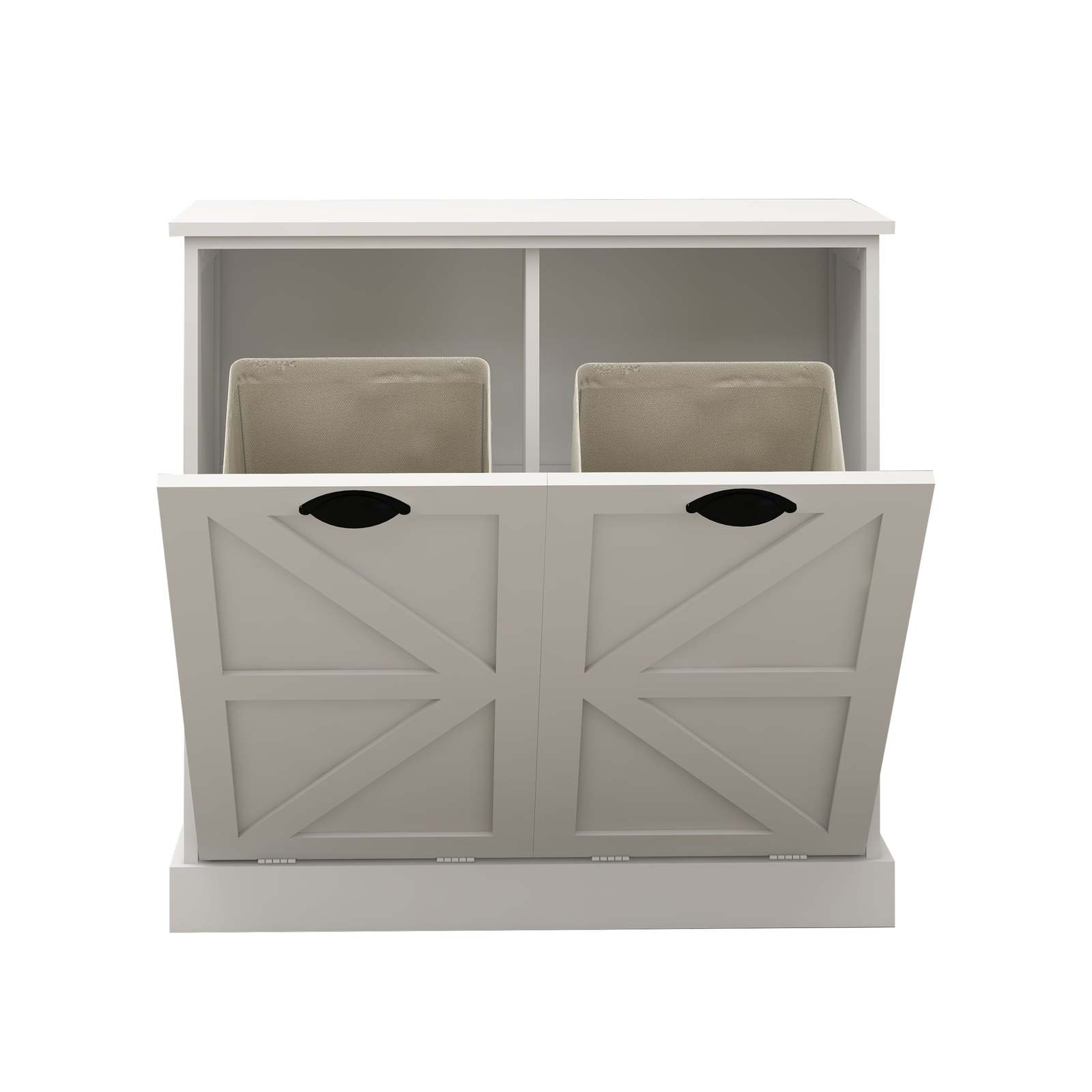 White Two-Compartment Tilt-Out Laundry Sorter Cabinet