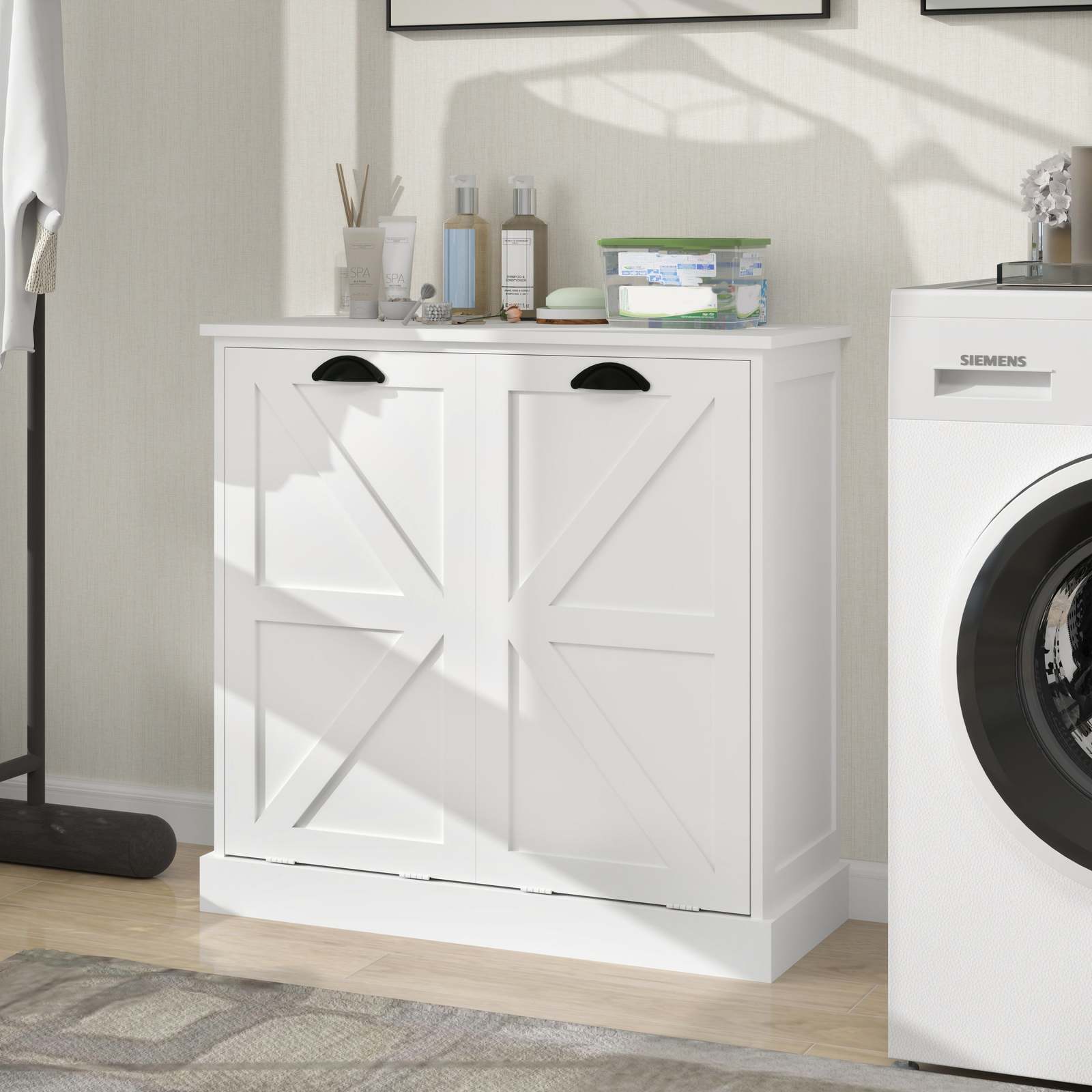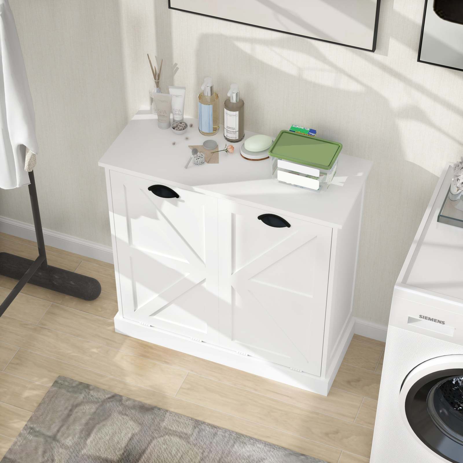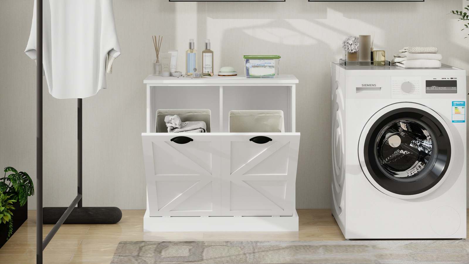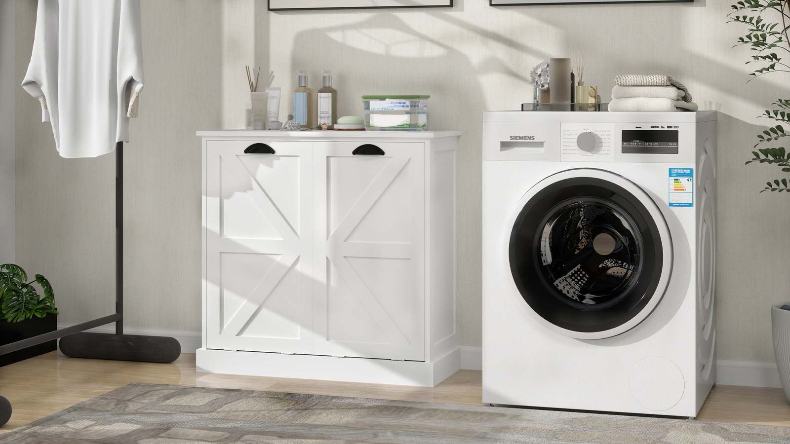 Fashion Unique Design:This Laundry Sorter Cabinet has an elegant white finish and beautifully flowing lines, exuding an air of sophistication and elegance! Whether your home is decorated in a modern or retro style, this Cabinet fits perfectly and reflects your extraordinary taste.
