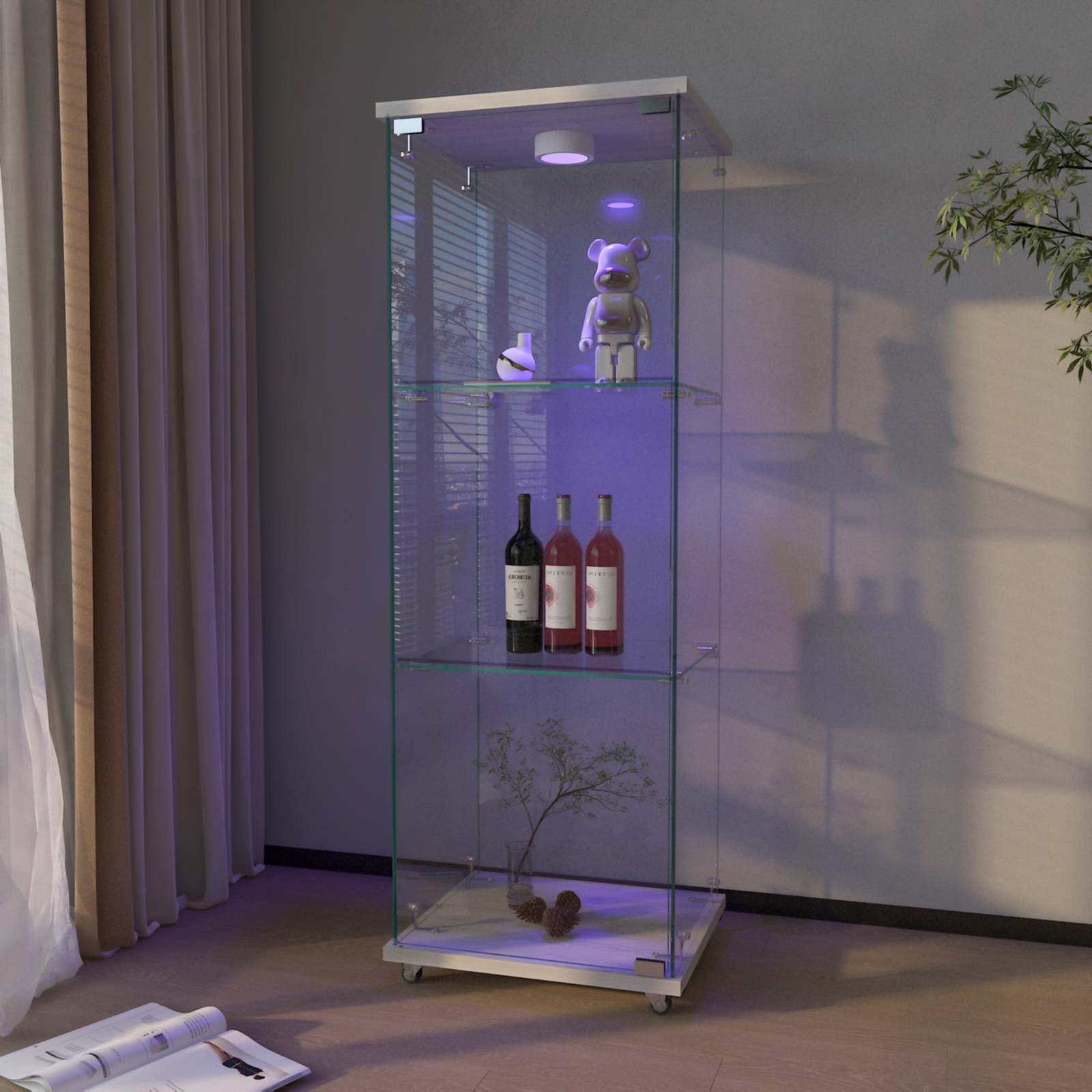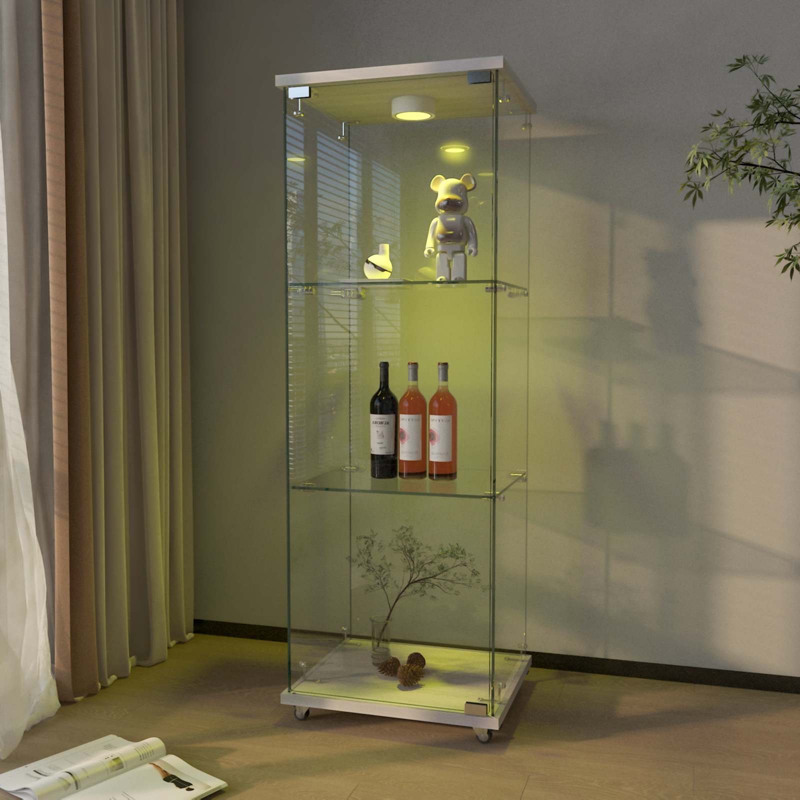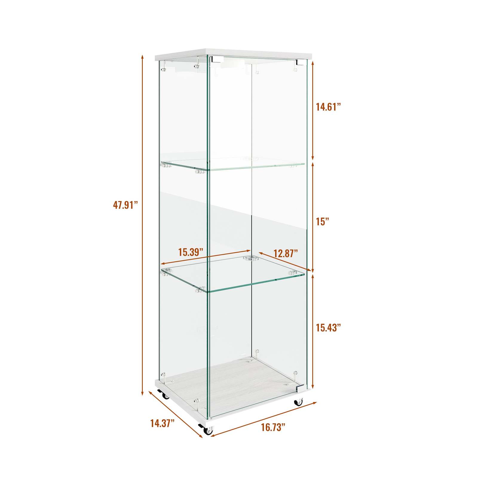 1.Glass Display Cabinet: Size 47.91'(H) x 16.73'(L) x 14.37'(W) inches, each tempered glass is 5mm thick. The 3-layer shelf is designed to be sturdy and stylish. The glass doors are easy to open and close. It is equipped with 4 caster wheels with brakes.